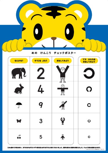 イラストや数字を見ながらクイズをしたり真似をしたりして遊ぶことができ、親子で楽しく目の健康を確認できるポスターです。