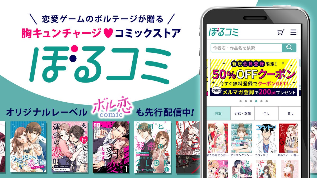 「ぼるコミ」は、延べ8000万人※の女性が楽しんだ恋愛ゲームを制作・運営するボルテージが贈る“胸キュンチャージ♡コミックストア”です。女性向け人気作品をはじめとした約150出版社の50万冊以上取り揃えているほか、 オリジナルの「ボル恋comic」・タテヨミ「ボル恋TOON」の先行配信や、各出版社の無料キャンペーン・お得なクーポンなどを数多く提供しております。