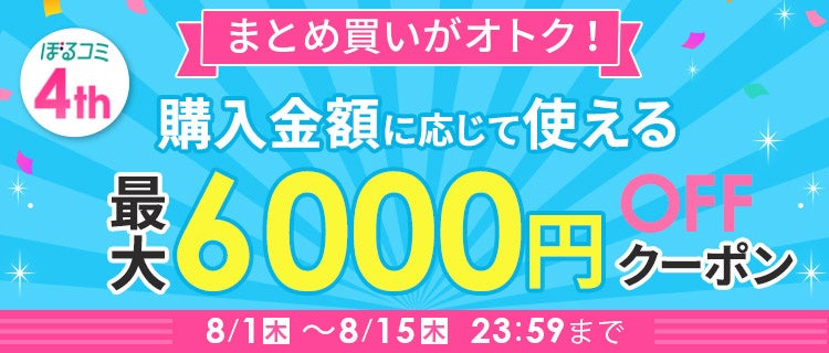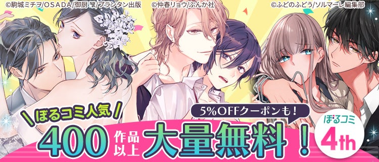2020年8月にオープンして以降、多くのお客様にご支持いただき、この度「ぼるコミ」は4周年を迎えることができました。日頃の感謝を込めて、「ぼるコミ」での人気作400作品以上の一挙無料配信や、最大6,000円OFFのお得なクーポンなど、「ありがとうキャンペーン」を実施いたします。