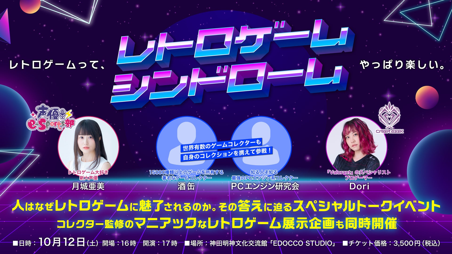 さらに、現役声優が多数在籍するeスポーツチーム「声優e-Sports部」から、大のレトロゲーム好きとして知られる声優の月城亜美さん、同じくeスポーツチーム「CYBER GEEK」で活躍中のプロゲーマー・Doriさんも参戦! レトロゲームを主軸にしつつも、近年ますます盛り上がりを見せるeスポーツの話など、新旧問わずゲームにまつわるさまざまなトークを繰り広げる。