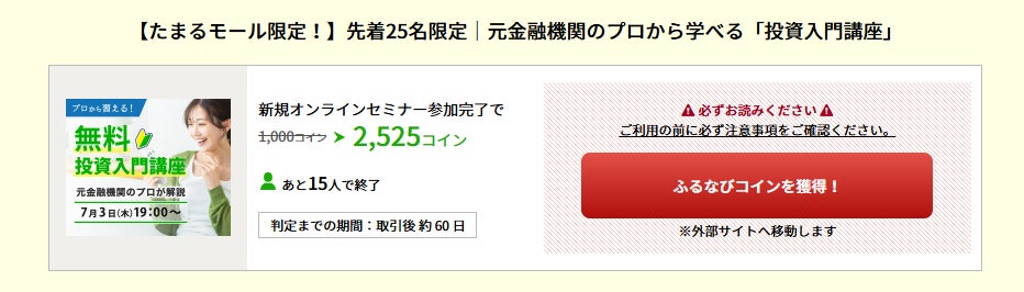 【7/3 19:00開催】先着25名限定!「たまるモールbyふるなび」にて、参加無料のオンラインセミナー『元金融機関のプロから学べる「投資入門講座」』が掲載開始!