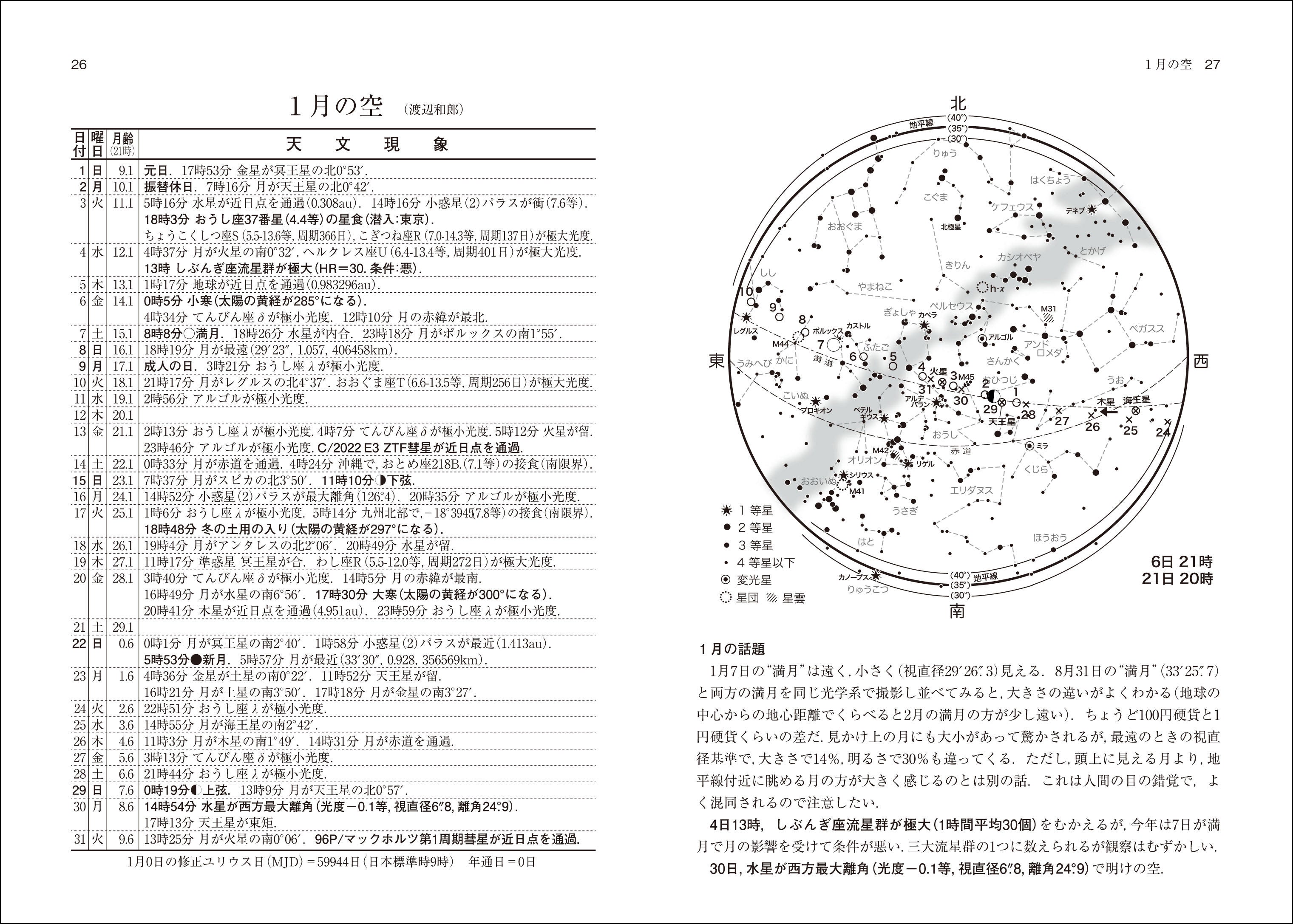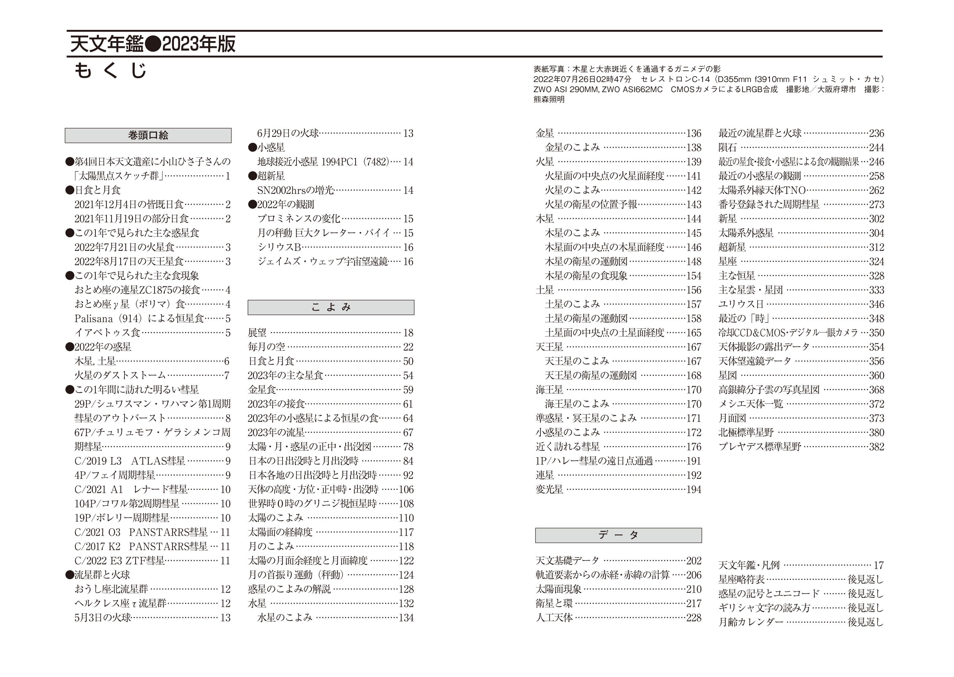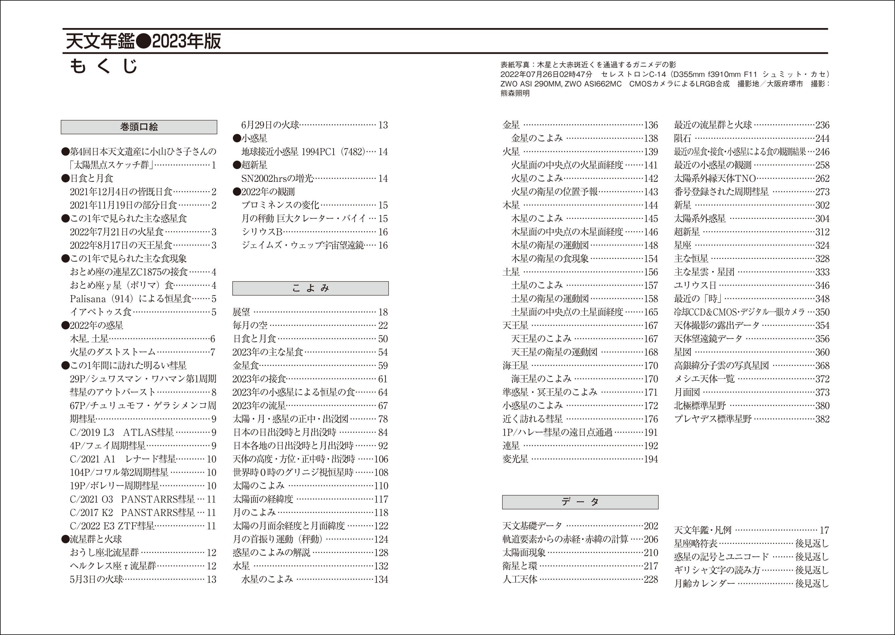 天文年鑑 2023年版は、2023年に起こる天文現象の予報と解説(全国8都市における日の出入り・月の出入りの時刻や月の出・月の入りの時刻をはじめ、毎月(12ヵ月)の星空、日食や月食などの食現象、各惑星の動き、準惑星や小惑星の動き、彗星の出現予報、流星群の予報など)や、2022年に起こった天文現象の観測結果を収録しています。