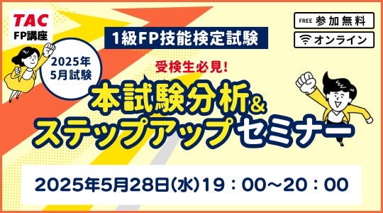ファイナンシャル・プランナー(以下、FP)、簿記検定試験、税理士、公認会計士などの資格取得に向けた教育サービスを展開しているTAC株式会社(東京都千代田区、代表取締役:多田 敏男)は、5/25(日)に実施される1級FP技能検定試験の受検生を対象とした解答速報「本試験分析&ステップアップセミナー」を5/28(水)に実施します。