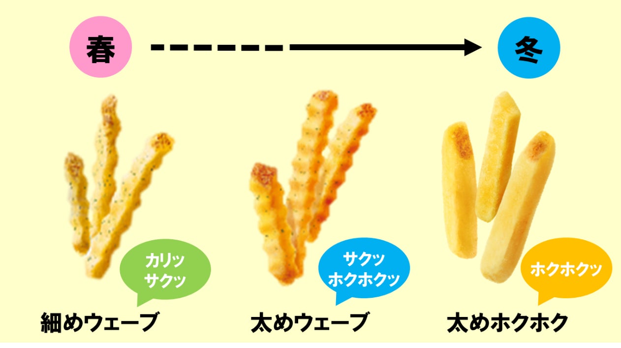 昨年より「Jagabee」では、じゃがいもの多様なおいしさを楽しんでいただきたいという想いから、年に1回しか出会えない「味わい×カット」を組み合わせた期間限定の「Jagabee」として、「季節のフレンチフライシリーズ」を展開しています。