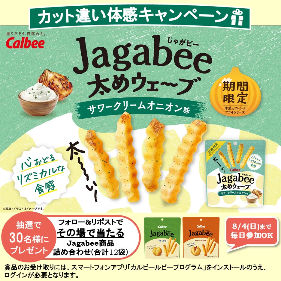 新商品の発売を記念して、カルビーPR部公式X(旧Twitter)アカウント(@calbee_PR)において、抽選で30名様に「Jagabee」カット違い食べ比べセットがその場で当たる、キャンペーンを実施いたします。