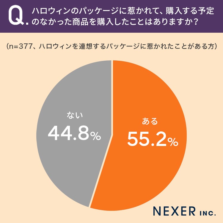 さらに55.2%の方が「ハロウィンのパッケージに惹かれて、購入する予定のなかった商品を購入したことがある」ようです。