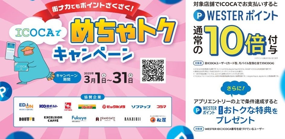 西日本旅客鉄道株式会社(本社:大阪府大阪市、代表取締役社長:長谷川 一明、以下「JR西日本」)は、2025年3月1日(土)~3月31日(月)の期間、「ICOCAでめちゃトクキャンペーン」を実施いたします。この期間において、1,300超の駅ナカや街ナカの対象店舗にてICOCAでお支払いいただいた方には、お買い上げ200円(税込)につき通常1ポイントのところ、10倍のWESTERポイントを付与いたします。さらに、「WESTER」アプリエントリーの上で条件を達成すると、おトクな特典をプレゼントいたします。