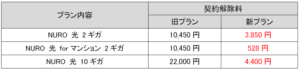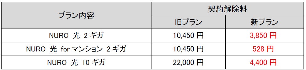 下り最大2Gbps(*1)のサービスにおいては、「NURO 光 2ギガ」および「NURO 光 forマンション 2ギガ」を新設します。このプランの契約解除料は、従来の10,450円から、「NURO 光 2ギガ」の場合3,850円へ、「NURO 光 forマンション 2ギガ」の場合528円へ改定します。