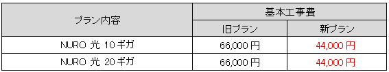 上り/下り最大20Gbps(*3)のサービスにおいては、「NURO 光 20ギガ」を新設し、基本工事費を66,000円から44,000円へ改定します。