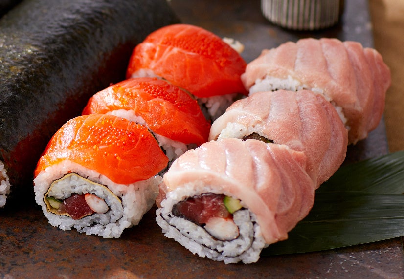 具には本マグロとボイルしたエビを入れて。厚切りのサーモンが食欲をそそる太巻と、贅沢に本マグロを使ったひと品は、大トロを豪快にのせた食べ応えのあるおいしさ。