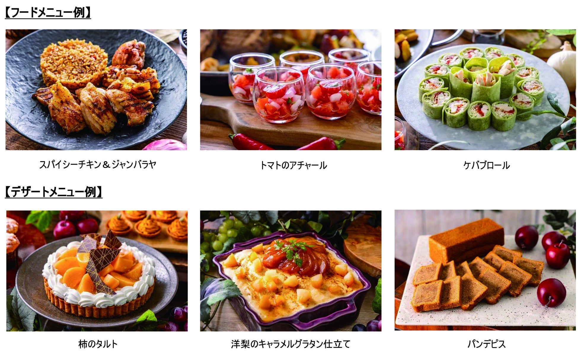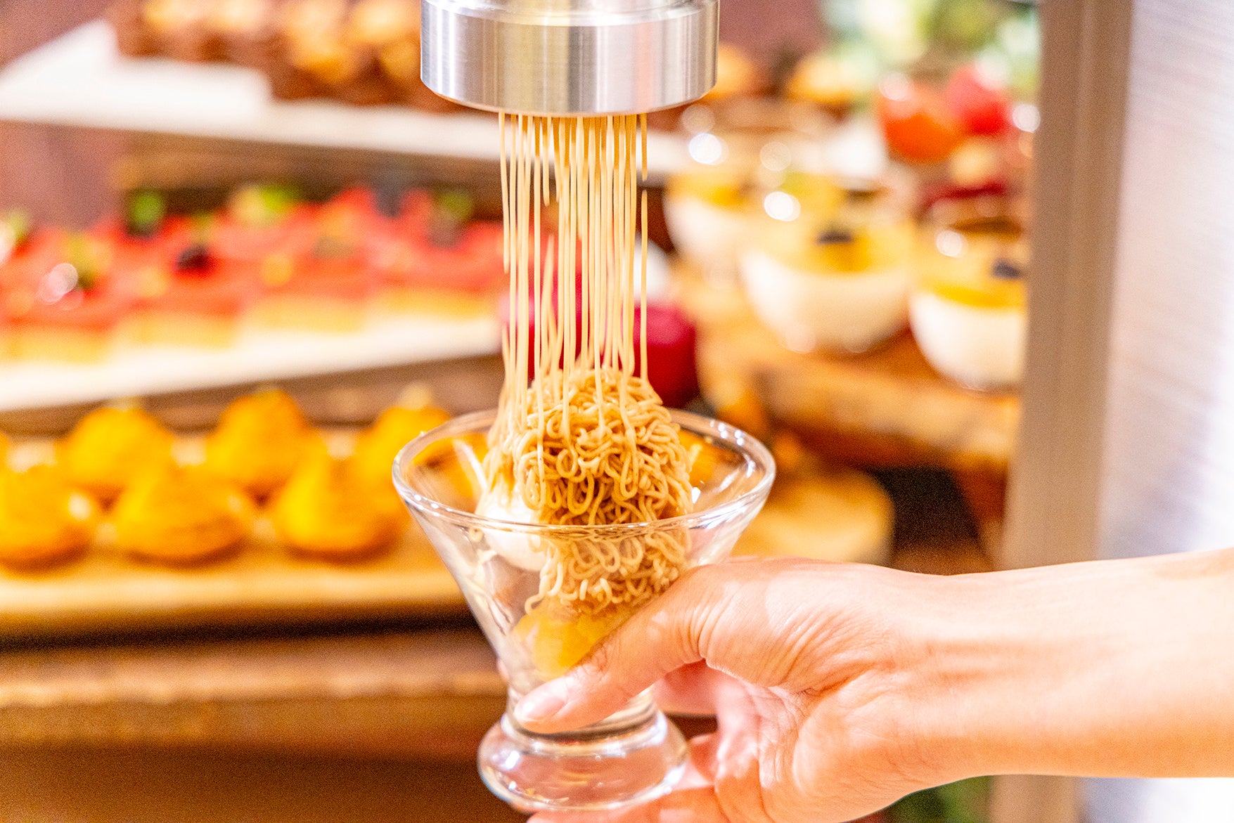 デザートエリアには、ジンジャー風味に仕上げた洋梨のキャラメルグラタン、シナモンを効かせたアップルパイ、スターアニス香る柿のタルトなど秋のフルーツとスパイスを巧みに組み合わせたパティシエの技が光る逸品をご用意。さらに、ライブステーションでご提供する極細モンブランは、お客様の目の前でマロンクリームを絞って仕上げます。ライブ感あふれるパフォーマンスとともにお楽しみください。