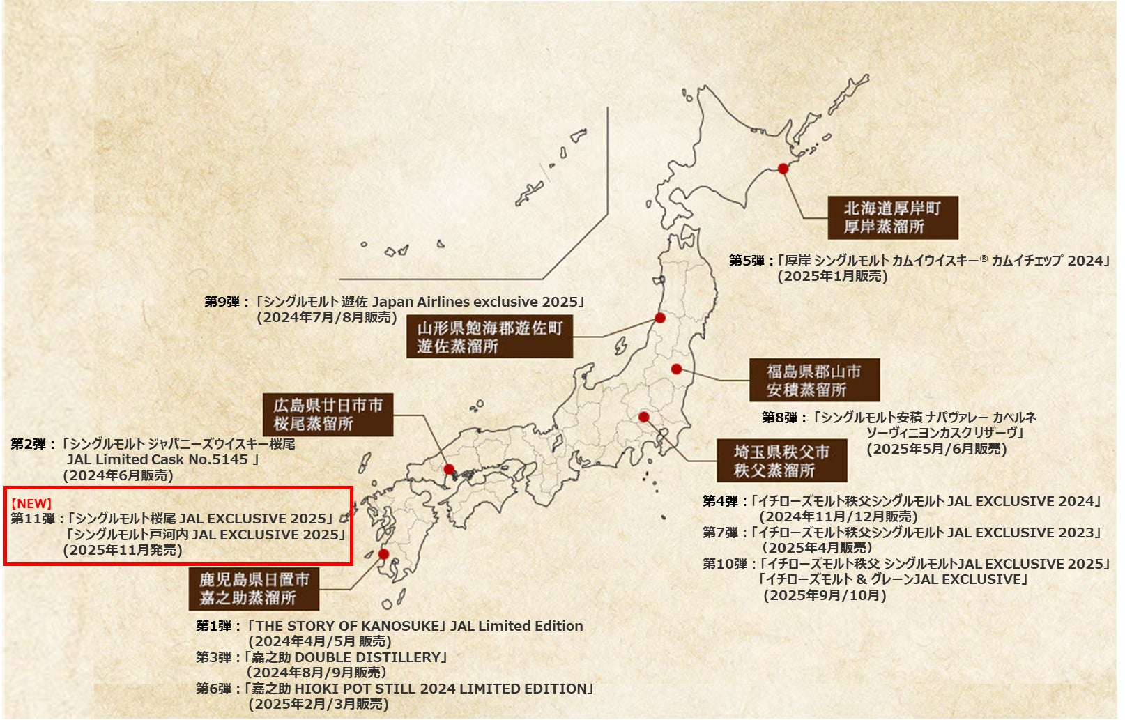 この取り組みの第11弾として、株式会社サクラオブルワリーアンドディスティラリー(所在地:広島県廿日市市、代表取締役社長:白井 浩一郎)の「シングルモルト桜尾 JAL EXCLUSIVE 2025」と「シングルモルト戸河内 JAL EXCLUSIVE 2025」を2025年11月1日から国際線機内販売にて数量限定で販売します。