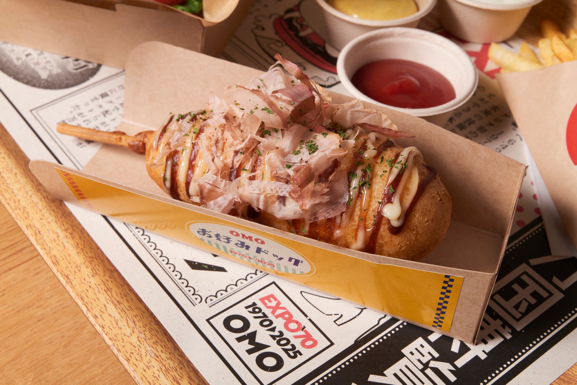 当時、人気を博し今でも親しまれているアメリカンドッグにソースとマヨネーズ、鰹節、パセリをトッピングし、まるでお好み焼きのような見た目に仕上げました。オリジナルソースは、デミグラスソースとウスターソースをブレンドしており、コクと豊かな風味が特徴です。外はさくっと、中はふわっとしたアメリカンドックの食感にお好み焼き風味が加わることで、新感覚な味わいを楽しめます。