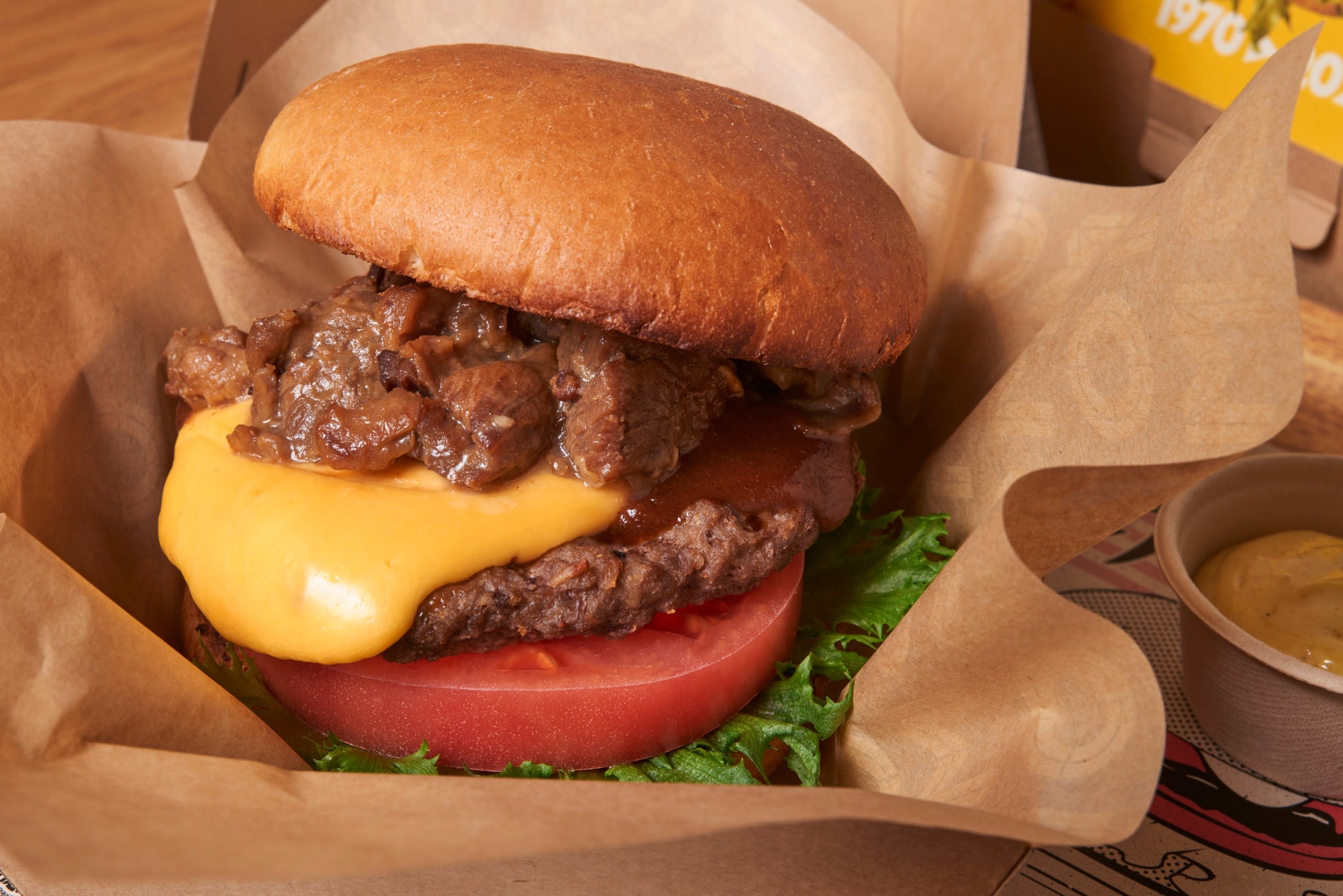 OMOどてやきバーガーは、パティの上に大阪名物であるどてやきを重ね、じゅわ~っと口いっぱいに広がる肉感を感じられる一品に仕上げました。さらに、どてやきの甘辛い味わいと、チーズの濃厚さ、バーベキューソースの酸味が合わさることで、洋風「どてやき」を楽しめます。セットのポテトには、当時の洋食文化をイメージさせる「カレー」「ヨーグルト」「ナポリタン」味のディップソース3種を添え、ドリンクに瓶のコーラをセットで提供します。
