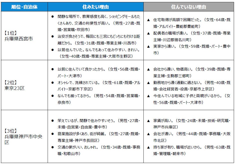 トップ3の「住みたい街」を選んだ理由は、生活や交通の利便性が良い街であり、さらに街並みの美しさ、おしゃれな環境への憧れ等を挙げるコメントが多く見られます。一方で、「住んでいない理由」については、家賃や物件の価格や、通勤のしにくさ等を挙げるコメントが多くなっています。