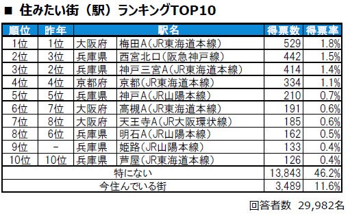 1位は3年連続で、梅田A[梅田・大阪梅田(阪急神戸線/阪神本線)・大阪・北新地・西梅田・東梅田を統合]です。2位は西宮市に位置する西宮北口(阪急神戸線)で、昨年3位から順位を上げました。3位は、神戸三宮A[三ノ宮・神戸三宮(阪急神戸線/阪神本線/神戸高速鉄道東西線)・三宮・花時計前を統合]です。トップ10内では、9位に姫路(JR山陽本線)が新たにランクインしています。