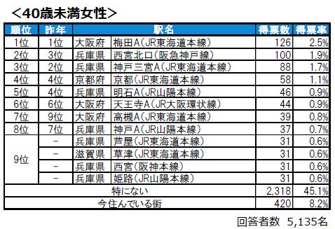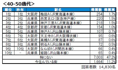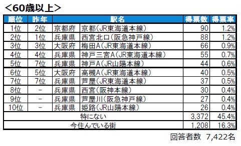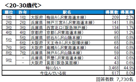 ●20-30歳代では、9位に芦屋と箕面が新たに同率でランクインしています。40-50歳代では、10位に姫路が新たにランクインしています。60歳以上では、西宮、芦屋川、姫路がランクインしており、トップ10には兵庫県の駅が7つ並ぶ結果となっています。