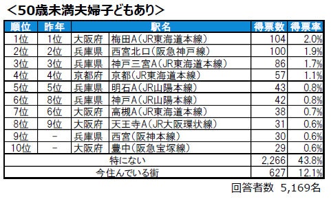●40歳未満の男性および女性、50歳未満の夫婦子どもありの各属性で、今年も梅田Aが1位です。また、40歳未満の女性および50歳未満の夫婦子どもありの家庭のトップ4は、順位の違いはあるものの、同じ顔ぶれがランクインしています。