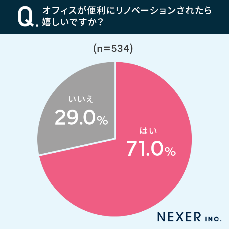 また、オフィスで働いている71%の方が「オフィスが便利にリノベーションされたら嬉しい」と答えていました。