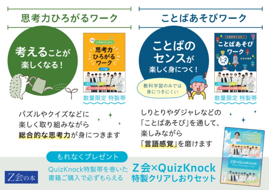 対象書店にて、「思考力ひろがるワーク」「ことばあそびワーク」をご購入いただくと、数量限定でZ会×QuizKnockオリジナルクリアファイルがもらえます。こちらは期間限定、数量限定の特別ノベルティですので、ぜひお早めにお求めください!