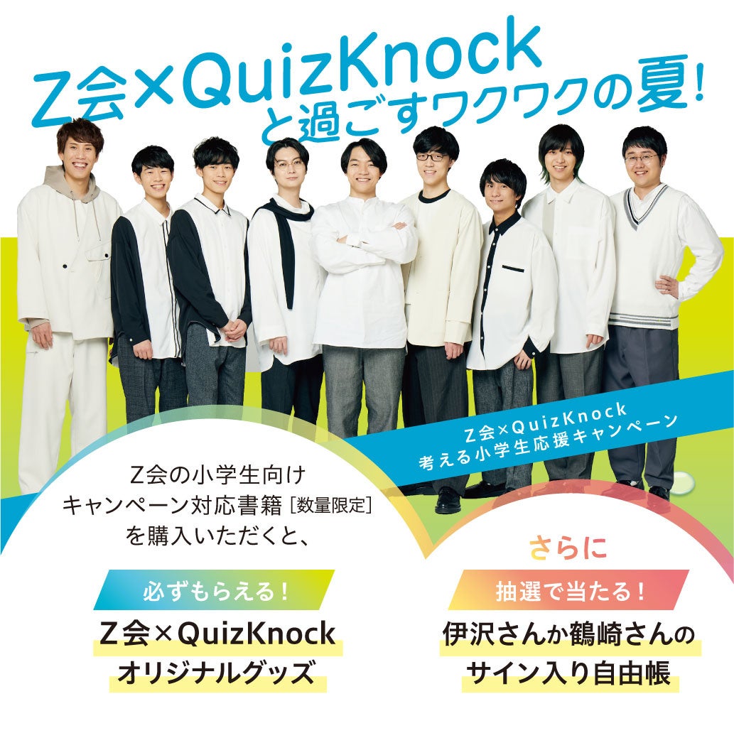 株式会社増進会ホールディングス(Z会グループ)のグループ会社、株式会社Z会ソリューションズは、株式会社batonが運営する知識集団「QuizKnock」と協力して、夏休みにがんばる小学生を応援するキャンペーンを2025年6月25日より実施いたします(キャンペーン書籍がなくなり次第終了)。キャンペーン帯が巻かれたZ会の小学生向け書籍を購入いただいた方には、オリジナルグッズを提供いたします。また、購入者限定で、QuizKnockのサイングッズが抽選であたるキャンペーンも実施!ぜひふるってご参加ください。