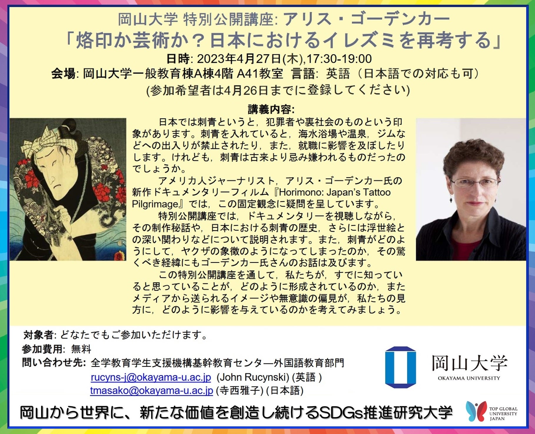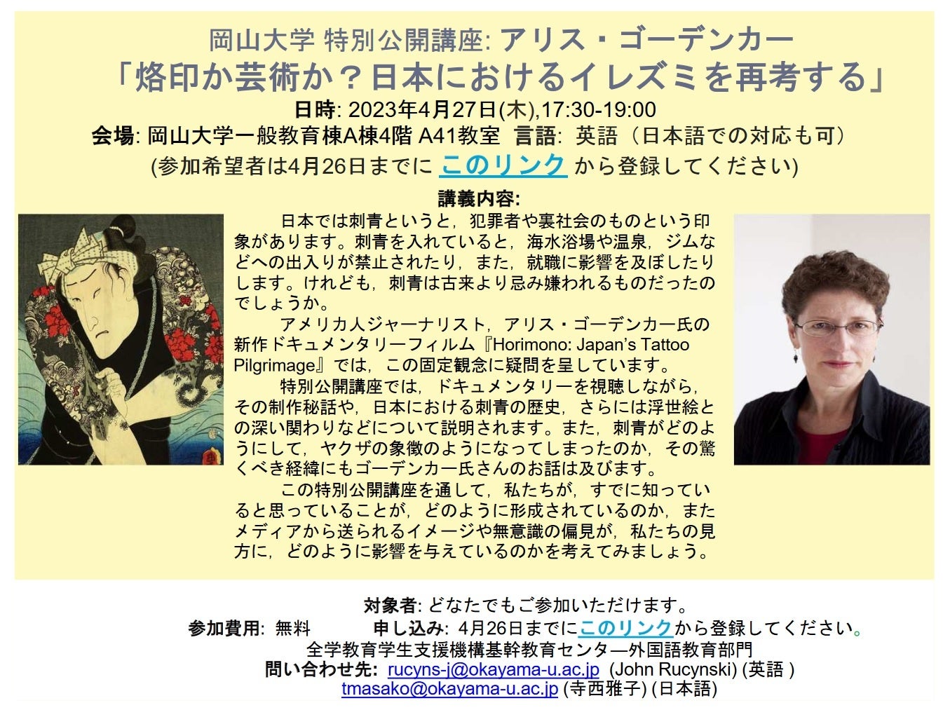 【岡山大学】特別公開講座 アリス・ゴーデンカー「烙印か芸術か?日本におけるイレズミを再考する」〔4/27,木 岡山大学津島キャンパス〕