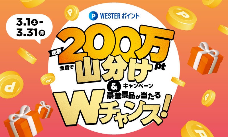 各期間にエキマルシェ・駅ナカ店舗でWESTERポイントを1ポイント以上ためた方全員で、100万ポイントずつを山分けプレゼントいたします。