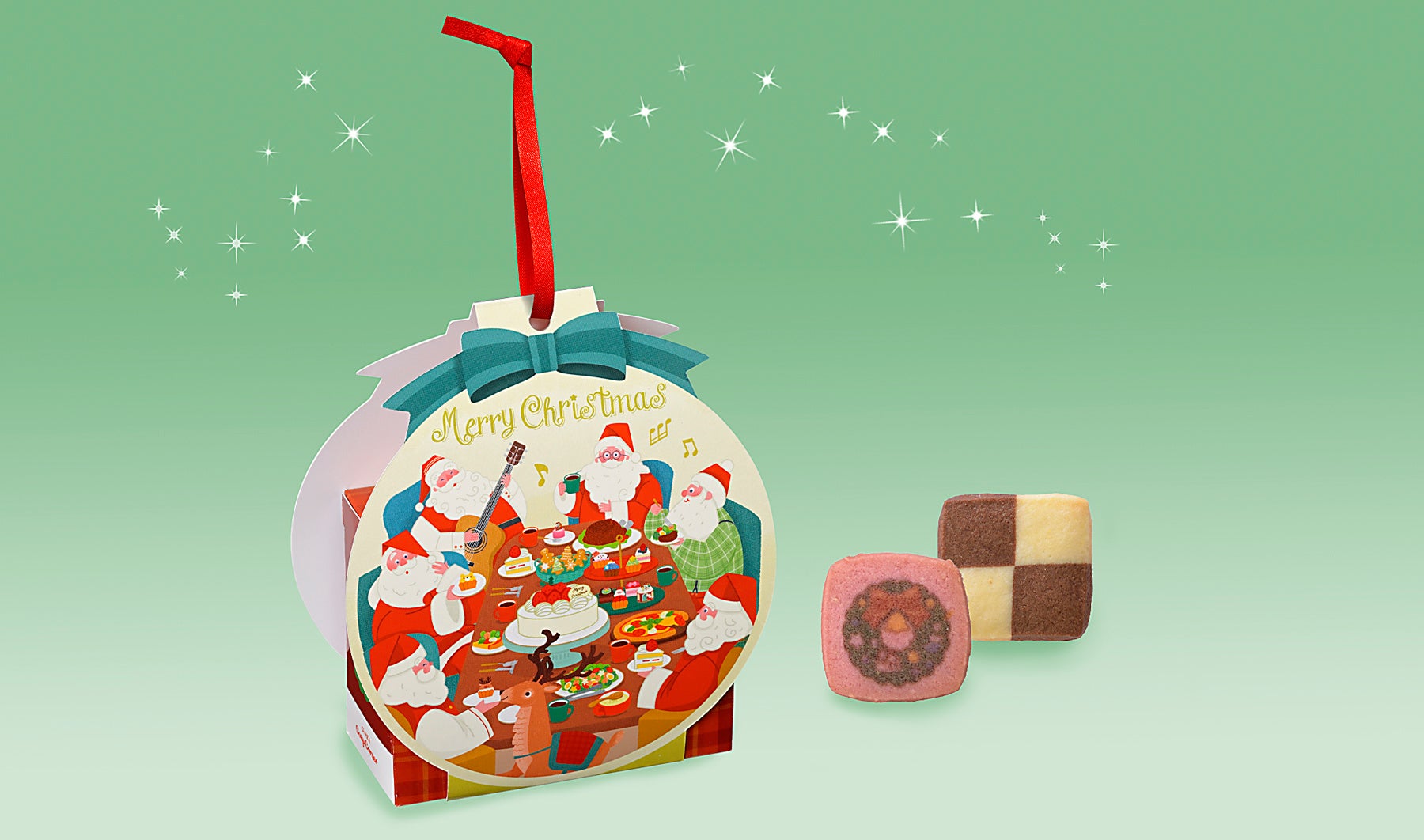 特長:スノードームをイメージしたボックスに、2種のクッキーをアソートしました。正面はサンタさんたちがパーティーをしている様子が、裏面は子どもたちへプレゼントを届けに行くサンタさんとトナカイのデザインが楽しめます。