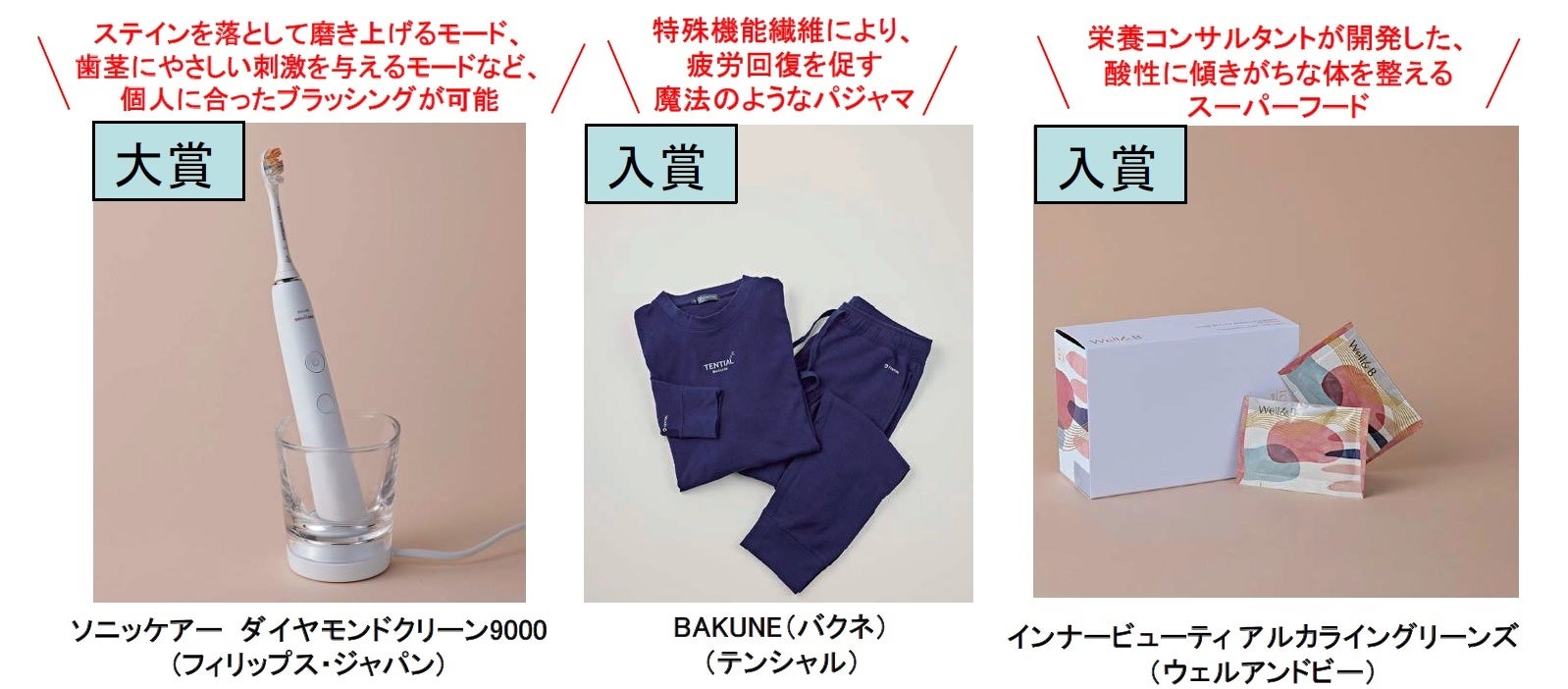 大賞には、電動歯ブラシ「ソニッケアー ダイヤモンドクリーン 9000」(フィリップス・ジャパン)が選ばれました。また、疲労回復を促すパジャマ「BAKUNE(バクネ)」(テンシャル)とスーパーフード「インナービューティ アルカライングリーンズ」(ウェルアンドビー)が入賞。他にも、基礎サプリメント「エクエル」(大塚製薬)は前回に続き支持を集め、殿堂入り特別賞となりました。