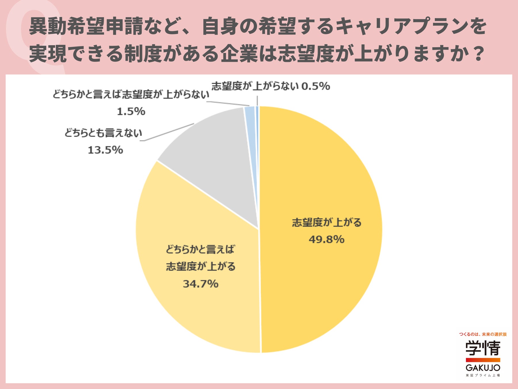 異動希望申請など、自身が希望するキャリアプランを実現できる制度がある企業は、「志望度が上がる」と回答した学生が49.8%に上りました。「どちらかと言えば志望度が上がる」34.7%を合わせると、8割以上の学生が「希望するキャリアを実現できる制度がある企業」は志望度が上がるとしています。「自身の適性や能力を活かして仕事をしたい」「転職をせずに自律的なキャリア形成ができる企業は魅力的だと思う」「希望するキャリアの実現に向けて、経験を積める環境で働きたい」といった声が寄せられています。