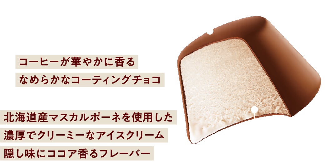 ①濃厚でクリーミーなマスカルポーネチーズを使用したアイスクリームを、コーヒーチョコでコーティングした、ひとくちアイスです。