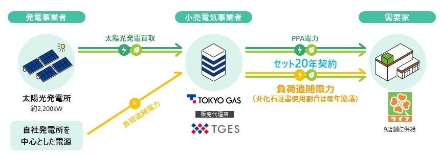 株式会社ライフコーポレーション(社長:岩崎 高治、以下「ライフコーポレーション」)、東京ガス株式会社(社長:笹山 晋一、以下「東京ガス」)、および東京ガスエンジニアリングソリューションズ株式会社(社長:小西 康弘、以下「TGES」)の3社は、ライフコーポレーションの首都圏9店舗へオフサイトコーポレートPPA[*1]スキーム(以下「本スキーム」)による再エネ電力の供給を実施することに合意しました。