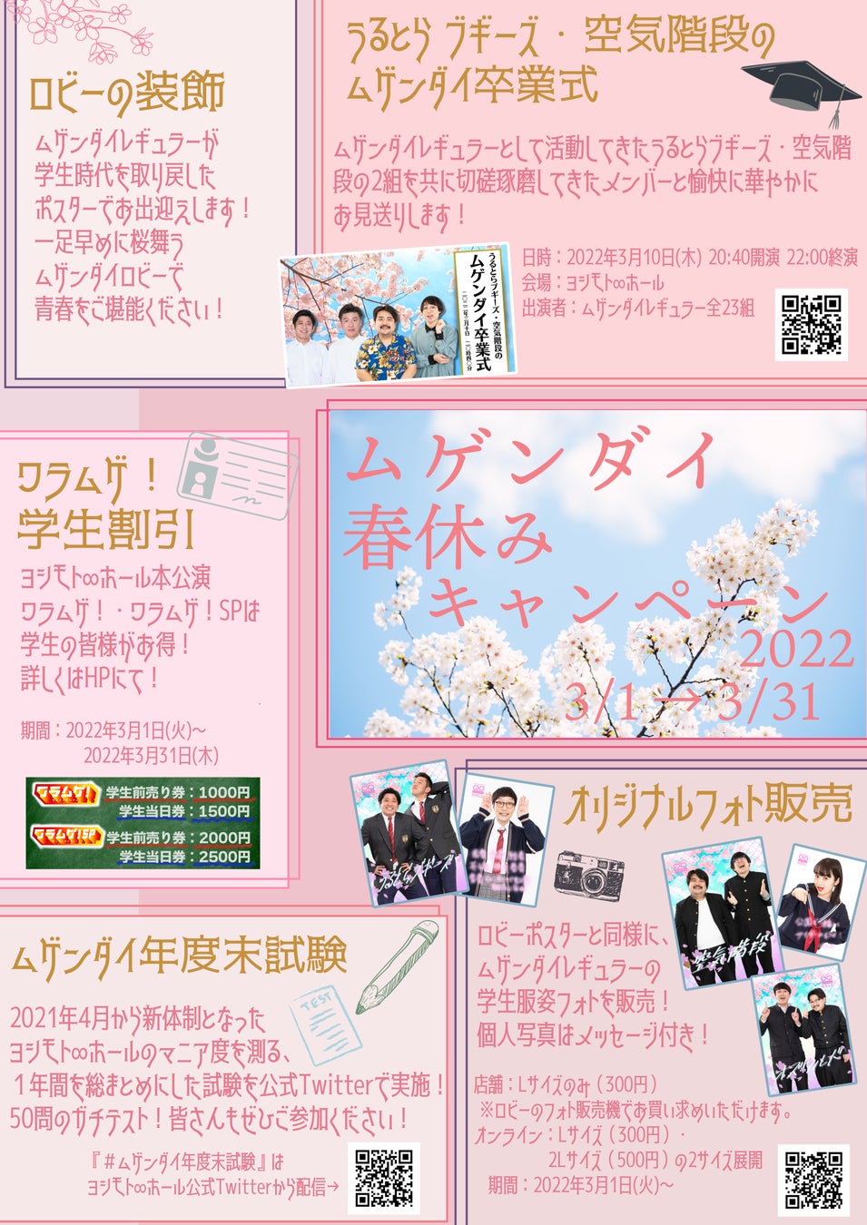 この度、東京・渋谷に構える、東京よしもとの芸歴9年目以上を中心とした今一番ホットで注目すべき若手芸人が活躍する劇場「ヨシモト∞ホール」「ヨシモト∞ドーム」は、『ムゲンダイ春休みキャンペーン2022』を2022年3月1日(火)から3月31日(木)までの1ヵ月限定で開催いたします。