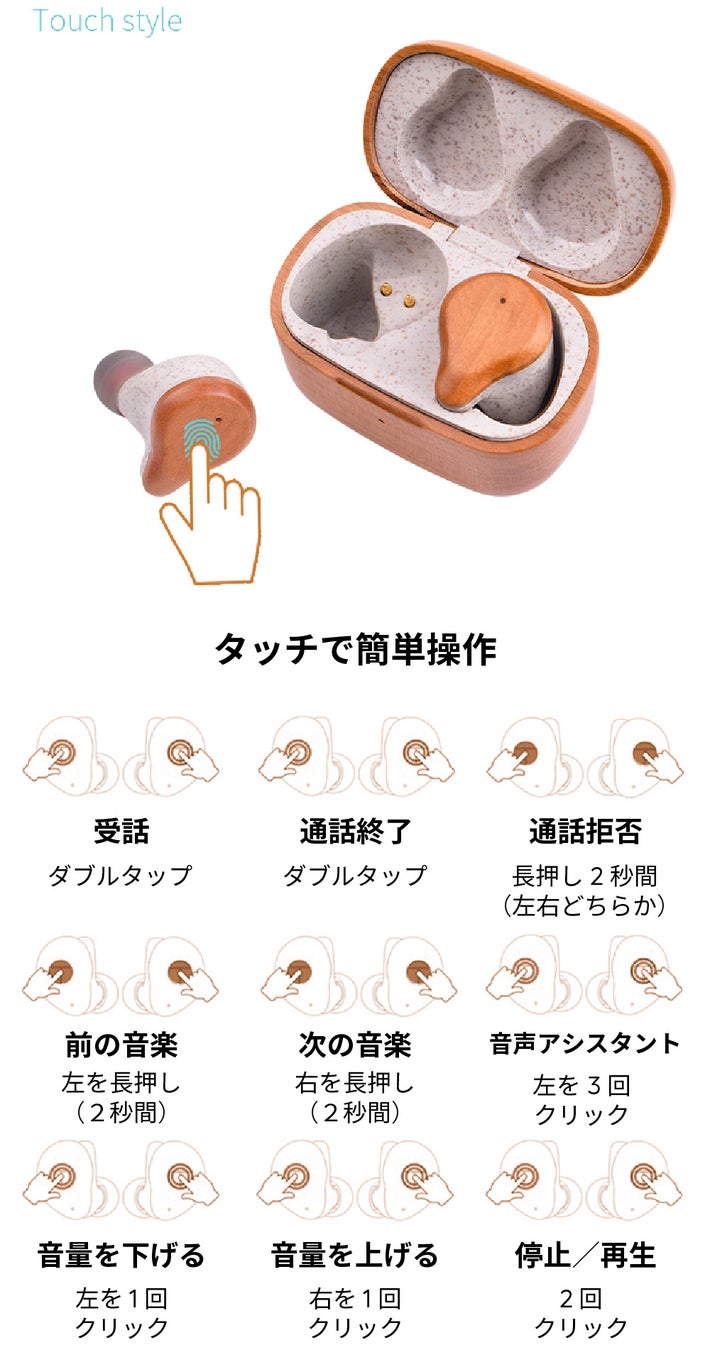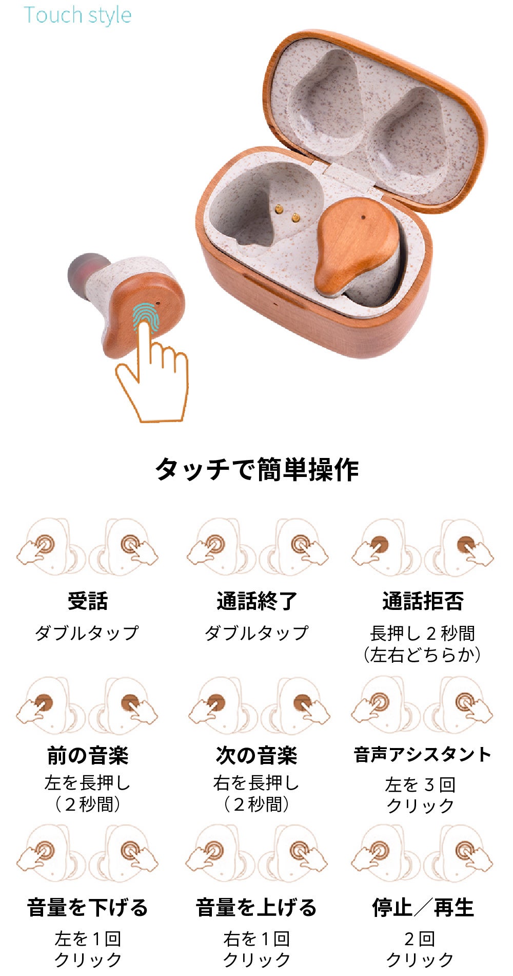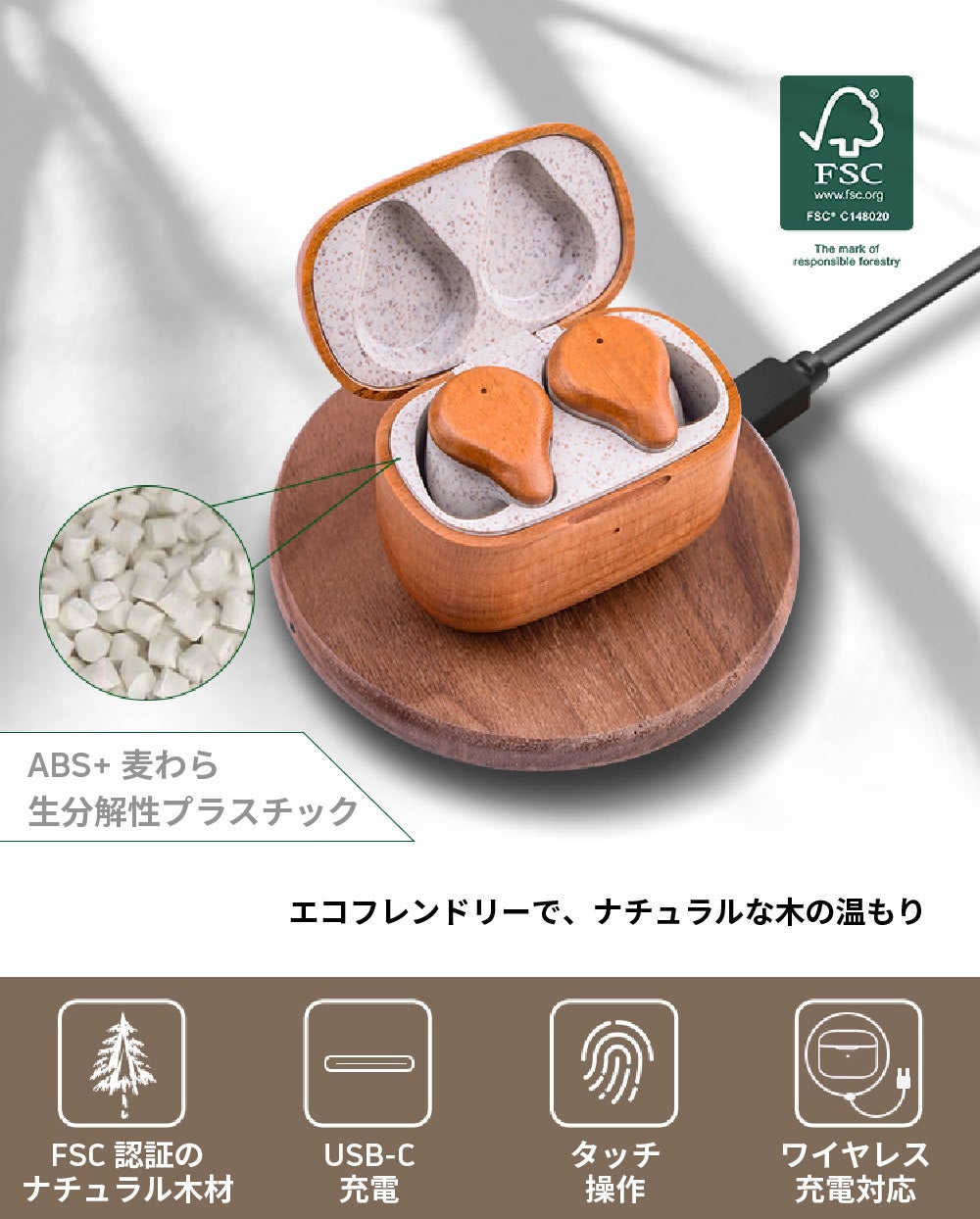 ケース表面と、イヤホン本体にビーチウッド素材を使い、手に取った時に木材のぬくもりを感じられます。