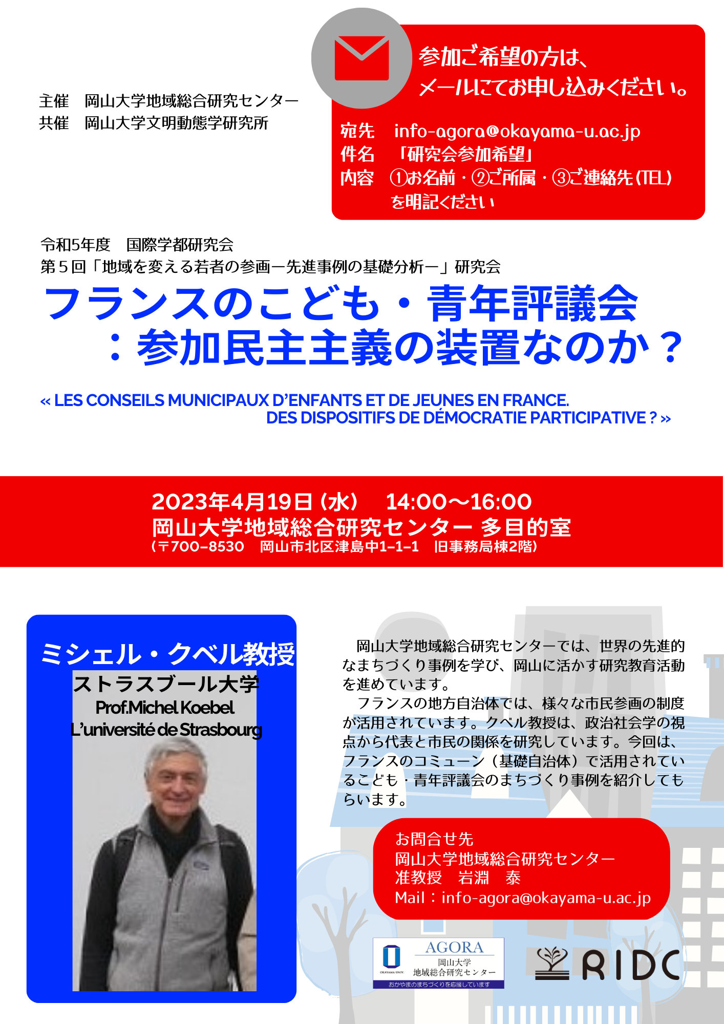【岡山大学】第5回「地域を変える若者の参画-先進事例の基礎分析-」研究会「フランスのこども・青年評議会:参加民主主義の装置なのか?」〔4/19, 水〕