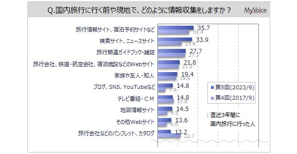 <今 回>(2023/9)https://myel.myvoice.jp/products/detail.php?product_id=30211 上記設問の他に、「最も印象に残っている国内旅行の同行者」「海外旅行の意向」なども聞いています。 <第4回>(2017/9)https://myel.myvoice.jp/products/detail.php?product_id=23014 <第3回>(2014/9)https://myel.myvoice.jp/products/detail.php?product_id=19416 |