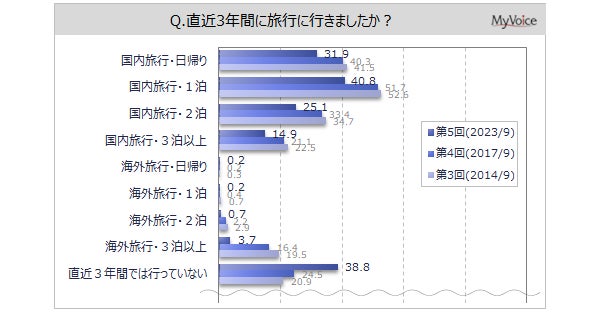 【旅行に関する調査】直近3年間に旅行に行った人は6割強、2017年調査より減少。今年9月以降に宿泊を伴う国内旅行に行く予定がある・行きたい人は2割強