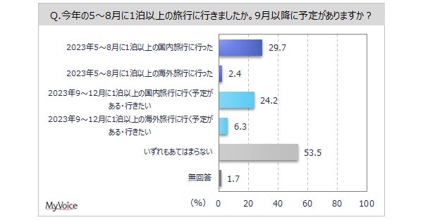 今年1泊以上の旅行に行ったかを聞いたところ、「2023年5~8月に1泊以上の国内旅行に行った」が29.7%、「2023年5~8月に1泊以上の海外旅行に行った」が2.4%です。