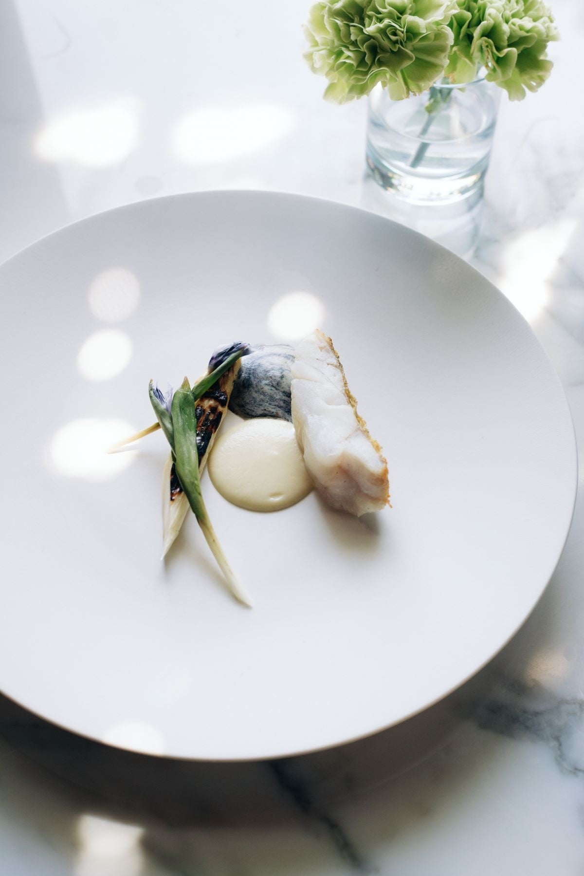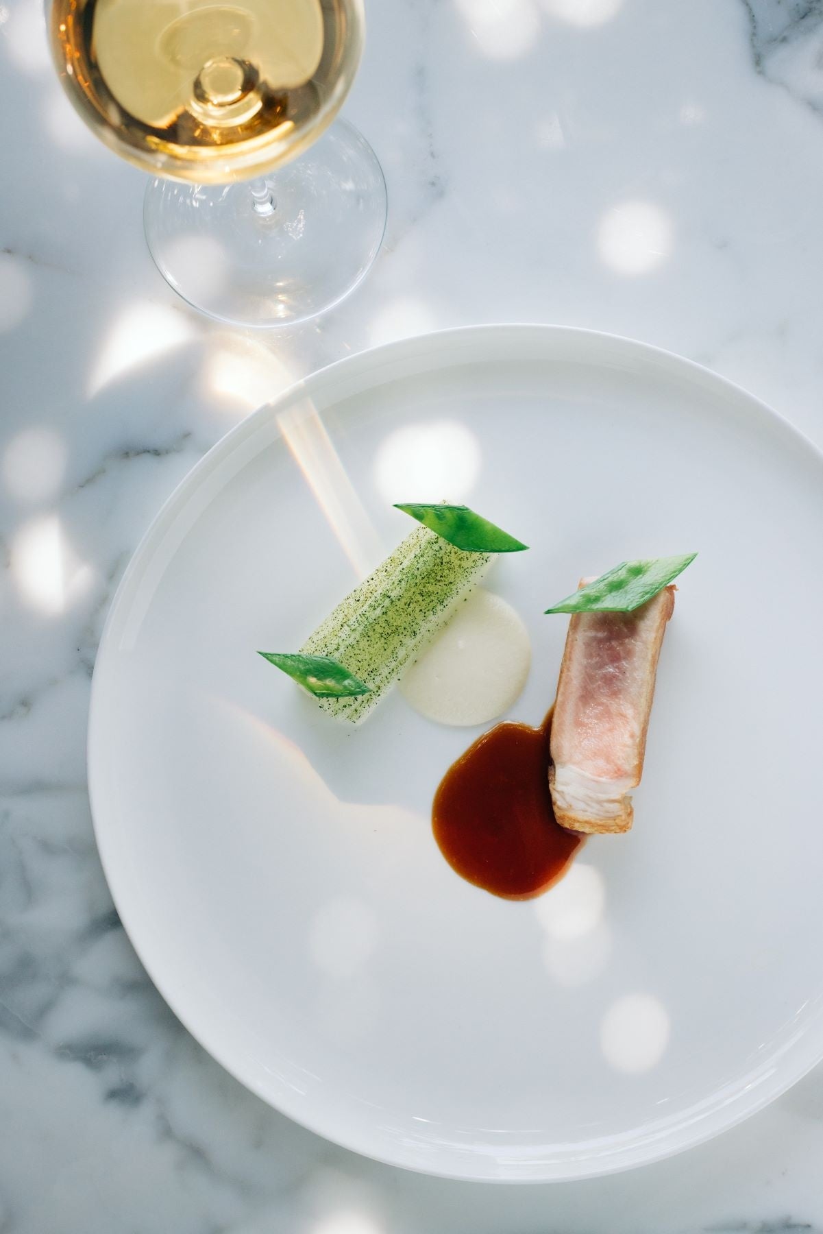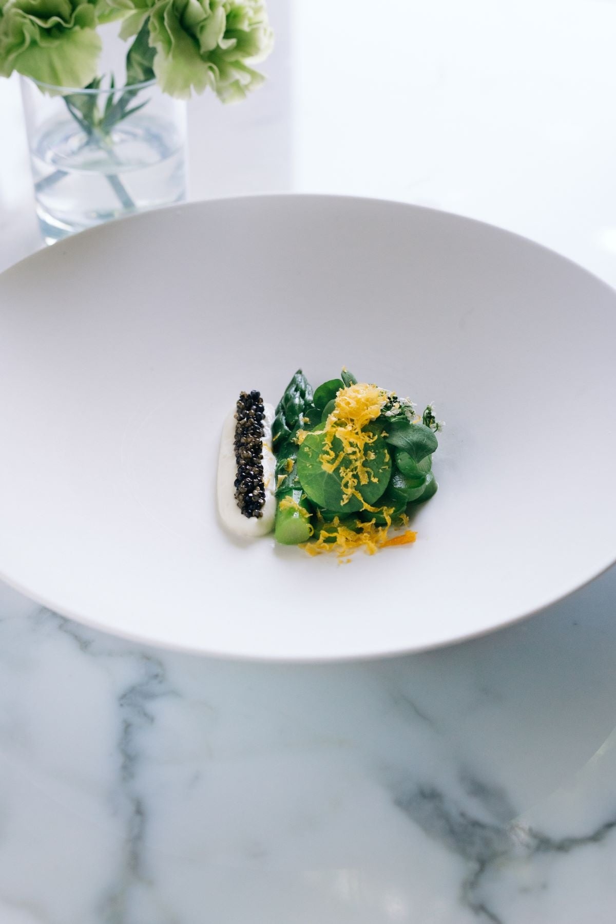 青羽太のロースト、塩麹でマリネしたホワイトアスパラガスの穂先のグリル、金時草の若芽の天ぷらに、ホワイトアスパラガスのピューレと新生姜のソース、アスパラガスの皮の焦がしオイルと発酵アスパラガスのバターソースを添えて。