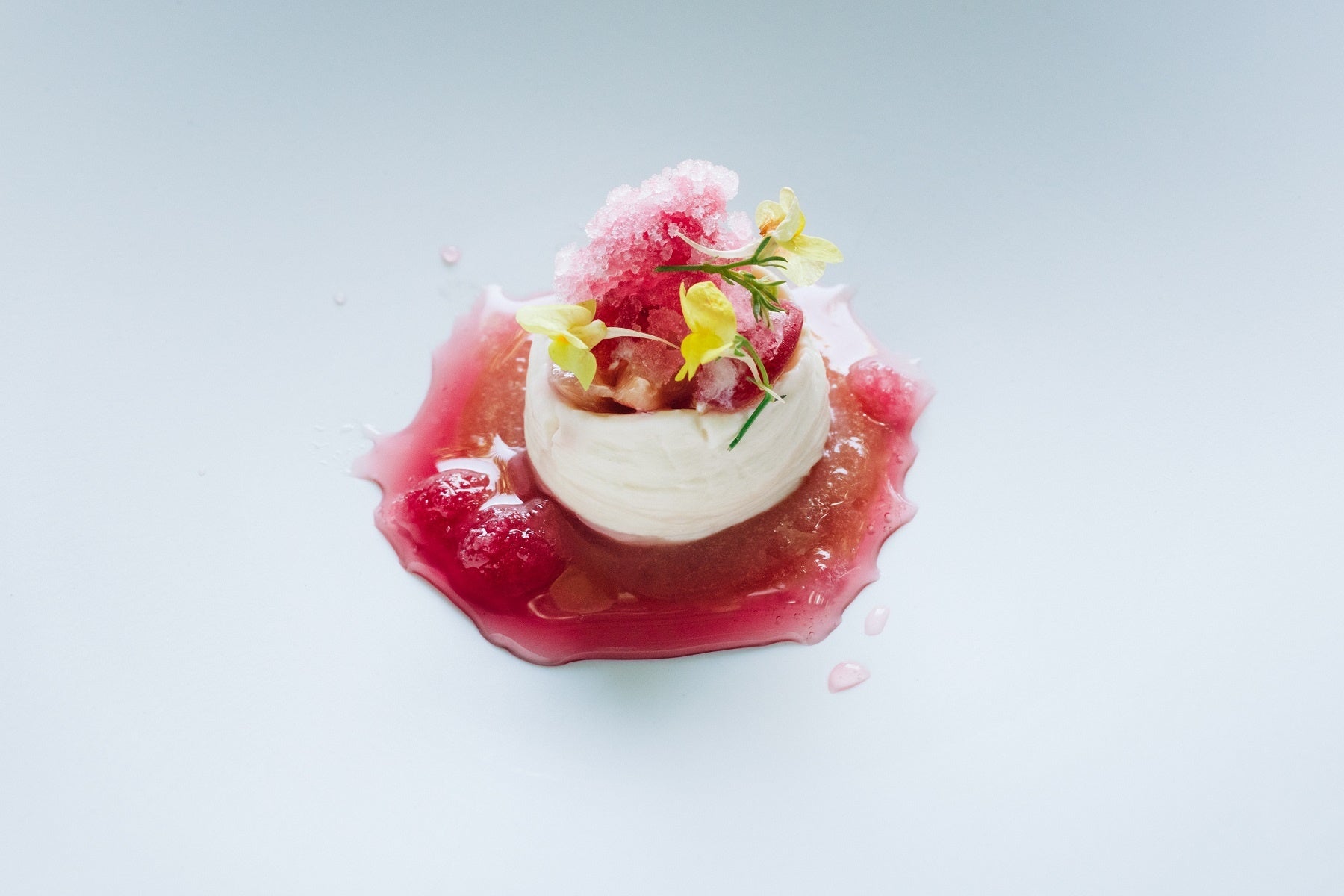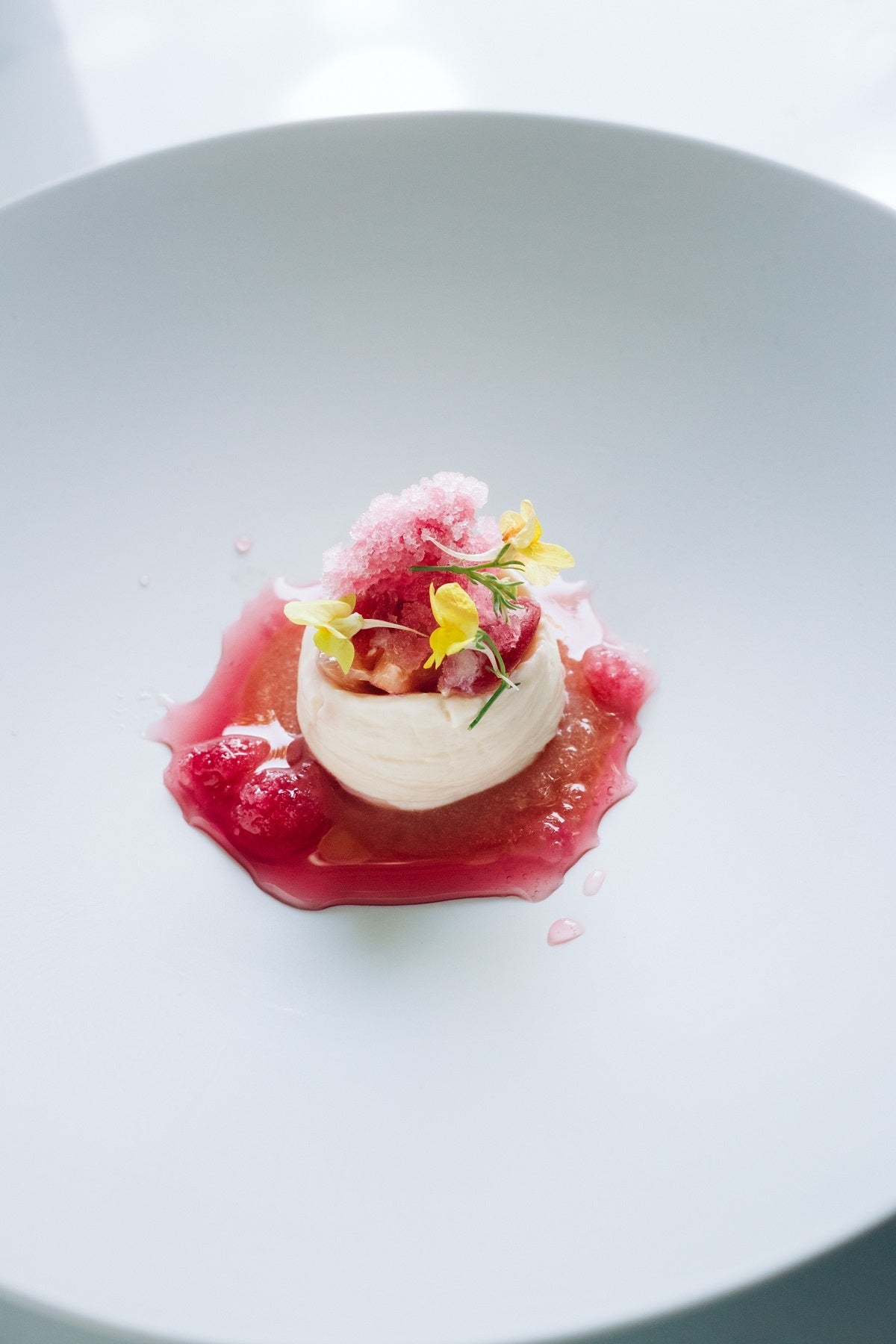 ピクルス、フレッシュ、ドライと、異なる方法で調理した余市産さくらんぼに、甘く仕立てた豆腐がほのかな塩味と甘み、クリーミーなテクスチャーを添えます。ピーナッツのサブレが食感のアクセントを加え、さくらんぼティーのグラニテがさっぱりとした後味に仕上げています。