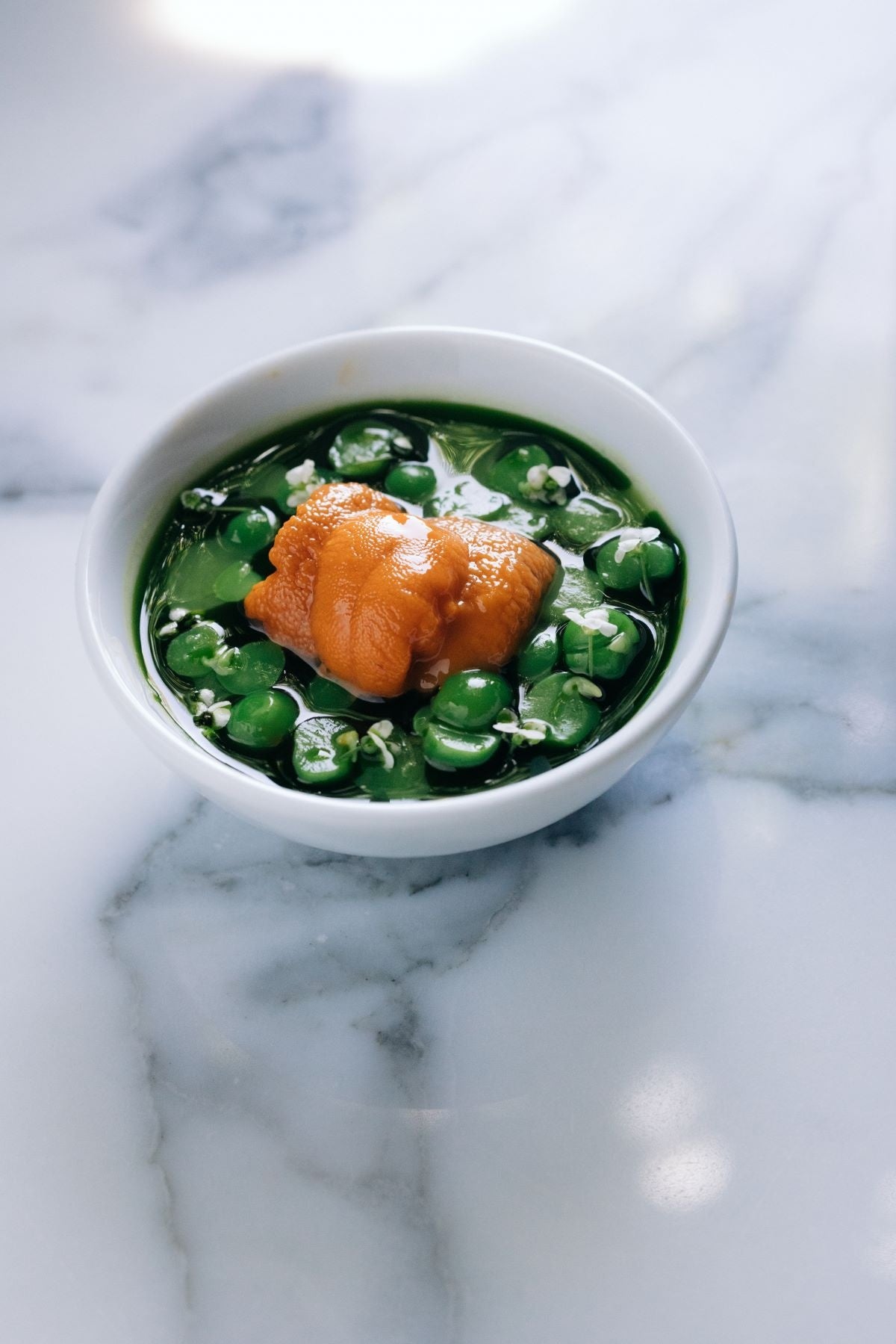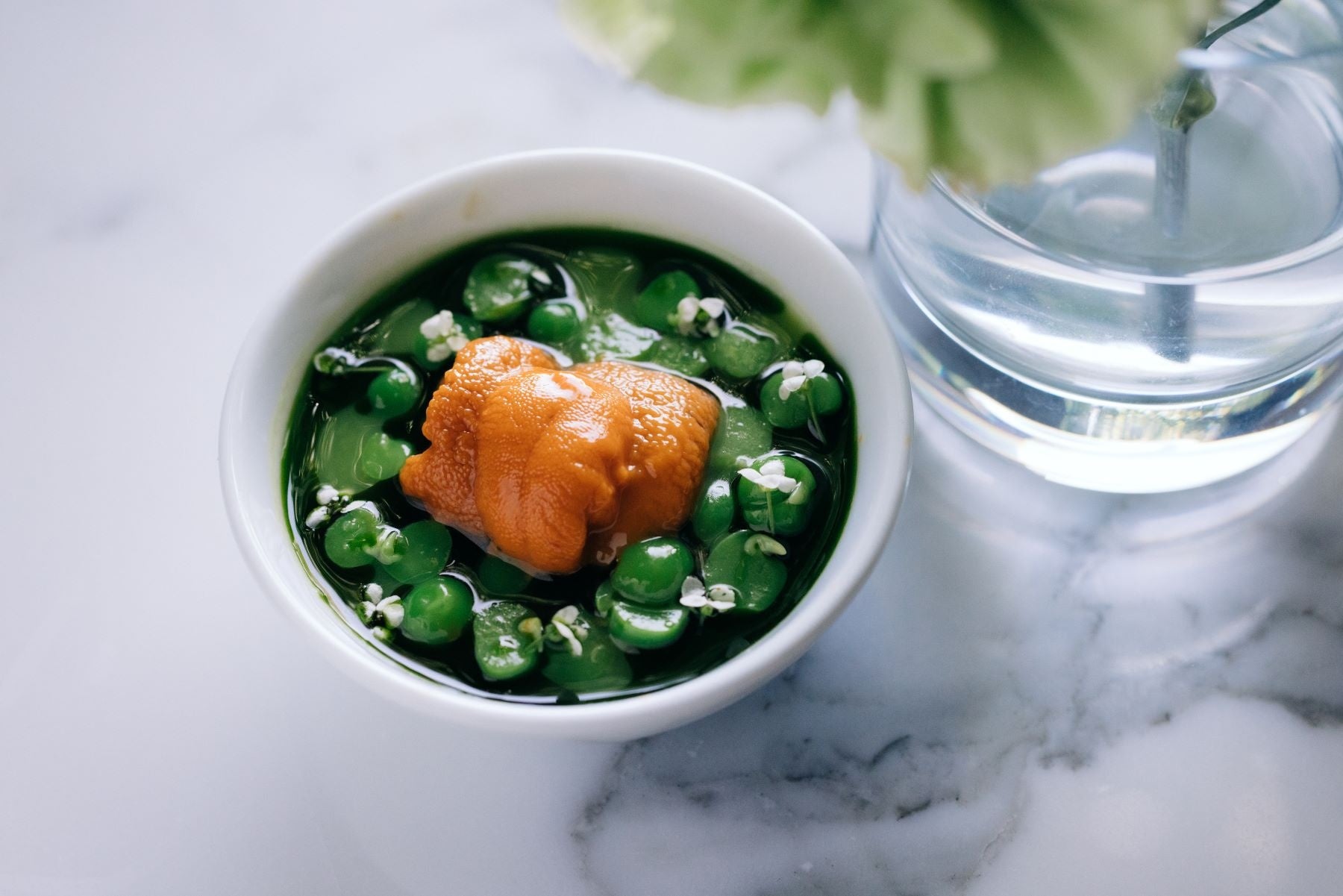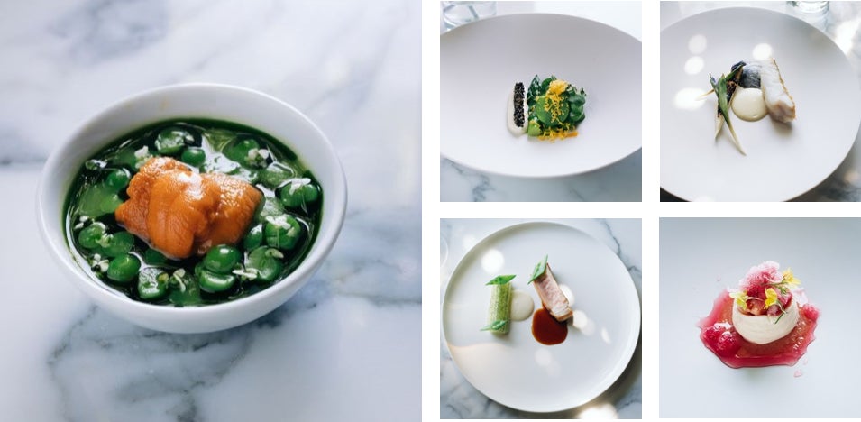 エンドウ豆のカスタードに余市産の雲丹を使用したクリーミーなソースを重ね、トップにはフレッシュな雲丹とエンドウ豆、香り高い三つ葉オイルがうま味を引き立てます。
