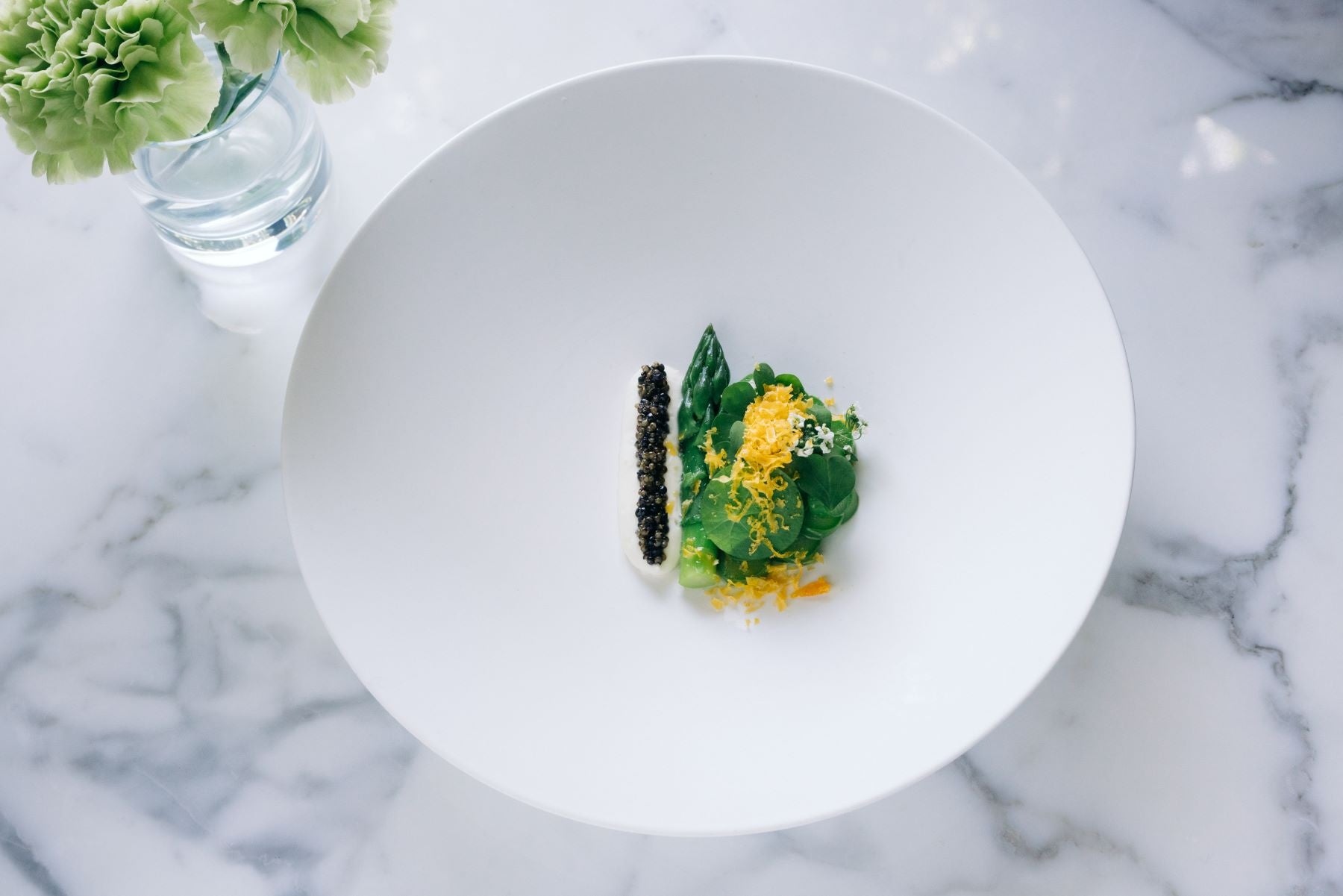 アスパラガスピューレとハーバルなドレッシングで和えたオキザリスとアスパラガスのサラダ、サイドにとんぶりとキャビアをあしらったミルクカード。卵の黄身が彩りと風味を添えます。