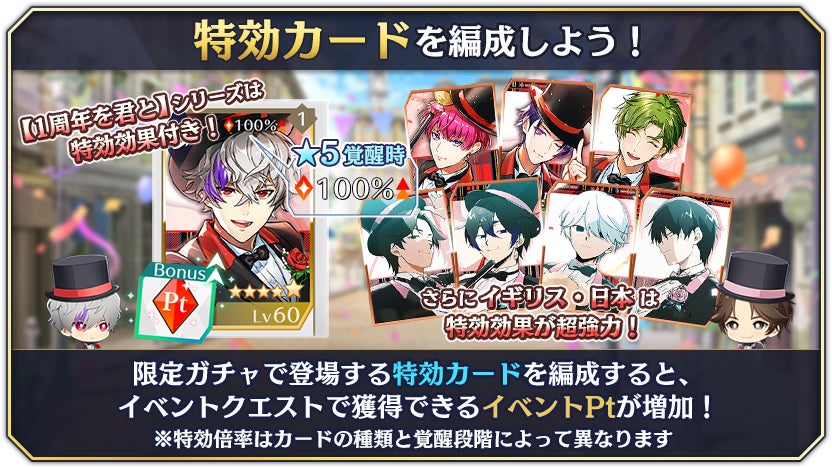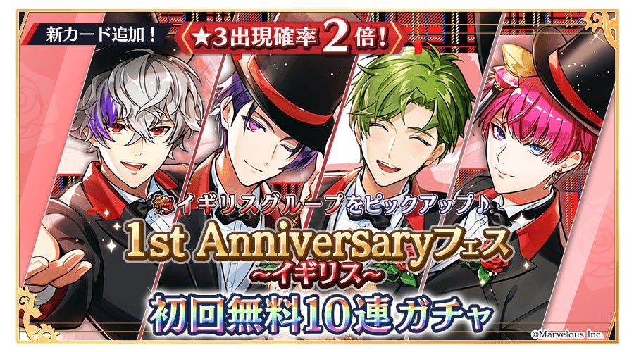 ※「1st Anniversaryフェス~イギリス~」と「★3確定有償限定1st Anniversaryフェス~イギリス~」のガチャでピックアップ対象となります。