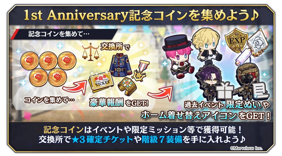 また、イベントクエストをクリアすると交換所で「★3確定ガチャチケット」と交換することができる「1st Anniversary記念コイン」がドロップされます! イベントPt報酬では、「イギリス」と「日本」の1周年イラストを使用したマスタースキルが獲得できます!ぜひ逃さずゲットしてくださいね!