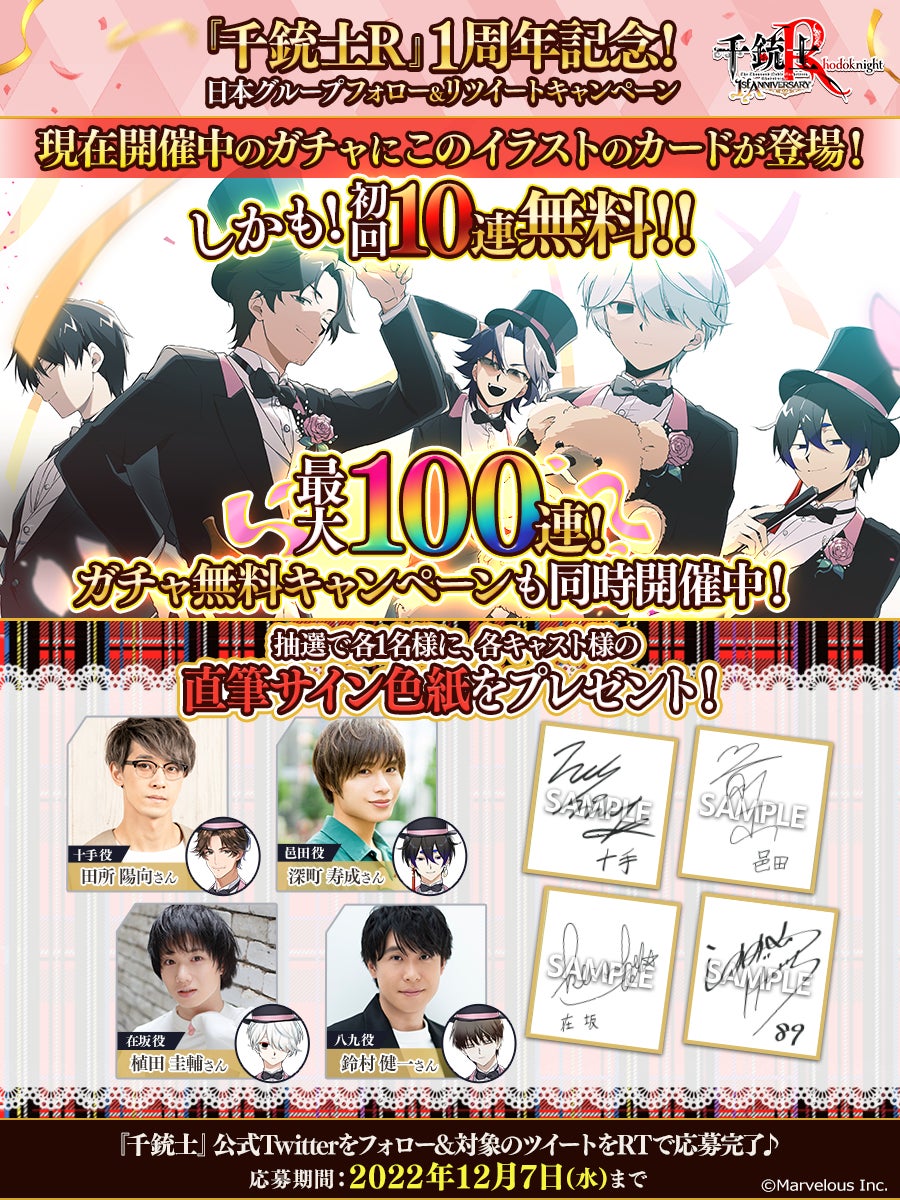 日本グループのピックアップガチャの開催にあわせて、『千銃士』公式Twitterアカウントでは田所陽向さん(十手役)、深町寿成さん(邑田役)、植田圭輔さん(在坂役)、鈴村健一さん(八九役)の直筆サイン色紙が抽選で各1名様に当たるフォロー&リツイートキャンペーンを開催中です。応募の締切は2022年12月7日(水)23:59まで!奮ってご応募くださいませ!