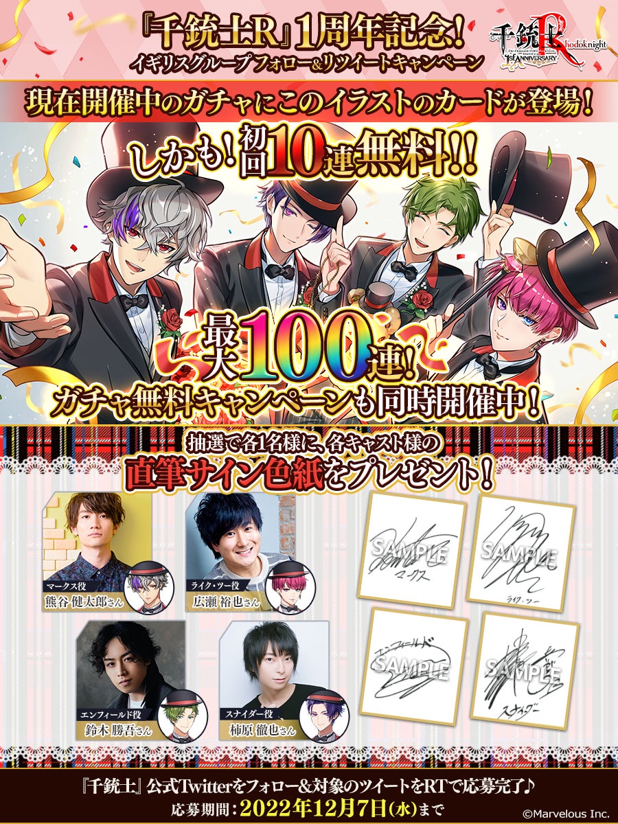イギリスグループのピックアップガチャの開催にあわせて、『千銃士』公式Twitterアカウントでは熊谷健太郎さん(マークス役)、広瀬裕也さん(ライク・ツー役)、鈴木勝吾さん(エンフィールド役)、柿原徹也さん(スナイダー役)の直筆サイン色紙が抽選で各1名様に当たるフォロー&リツイートキャンペーンを開催中です。応募の締切は2022年12月7日(水)23:59まで!奮ってご応募くださいませ!