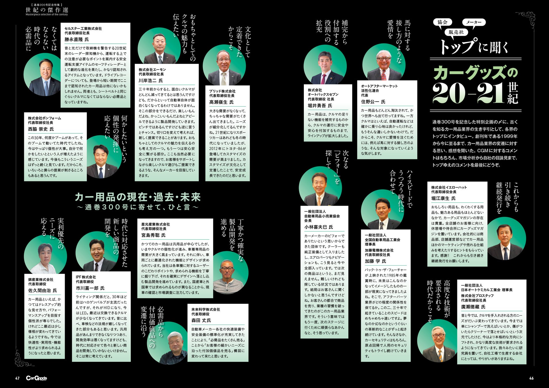 記念特集の巻末では、カー用品業界における各界の“生き字引”に直撃インタビュー。「カーグッズの20-21世紀」を、トップ視点で振り返る。