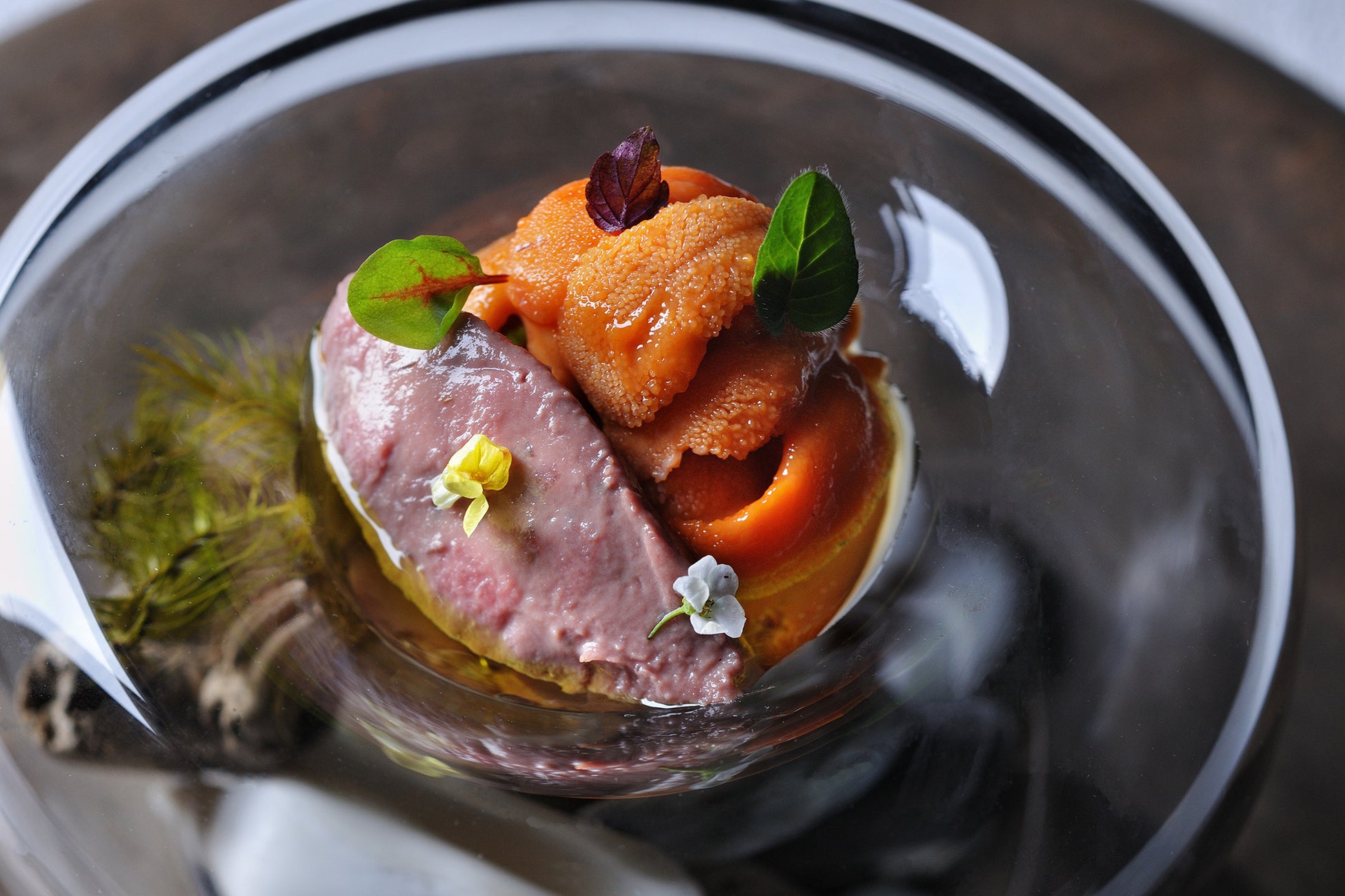 濃厚で甘みの強い雲丹と、低温でじっくりと火入れしペースト状にした夏鹿を組み合わせた冷前菜です。夏の鹿肉はクセが少なく、凝縮された旨みが特徴です。濃厚な雲丹の旨みと、雲丹醤油を隠し味に加えた奥深い味わいの鹿肉が調和し、意外性のある美味しさを堪能できます。