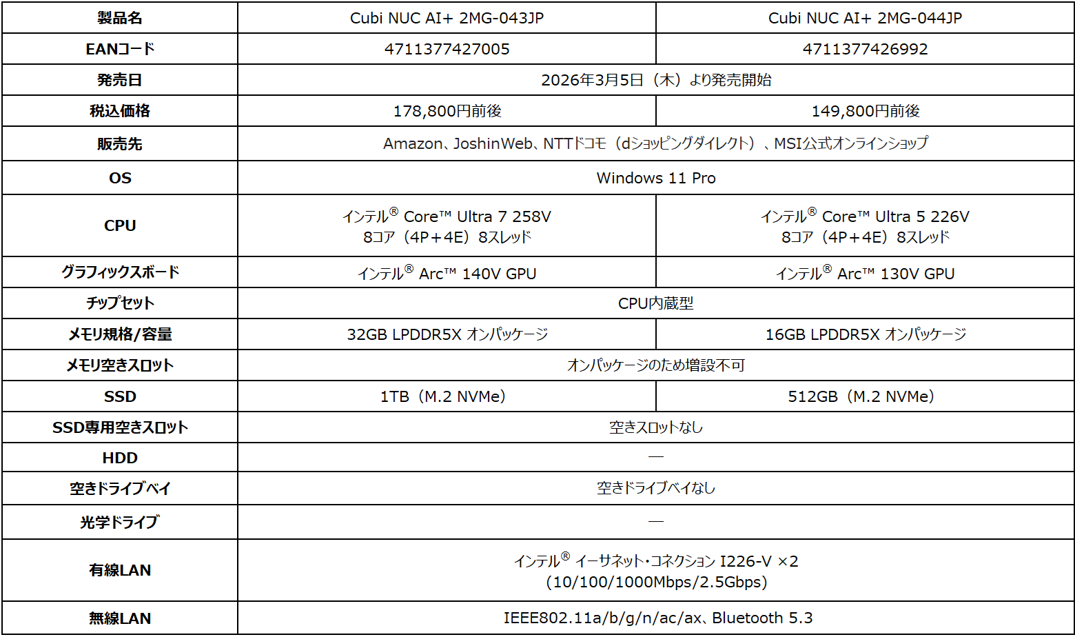 この度、エムエスアイコンピュータージャパン株式会社は2026年3月5日(木)より新たな製品を発売開始します。高いAI処理能力を備えたCopilot+ PCとしての機能を備え、インテル® Core™ Ultra 7 258V、メモリ32GB、 Thunderbolt™ 4、2.5G ×2のデュアルLAN、Wi-Fi 6Eなど充実の機能を搭載し、業務効率化と快適な作業環境を実現する「Cubi NUC AI+ 2MG-043JP」、インテル® Core™ Ultra 5 226V、メモリ16GB搭載の「Cubi NUC AI+ 2MG-044JP」が新たにラインナップに加わります。