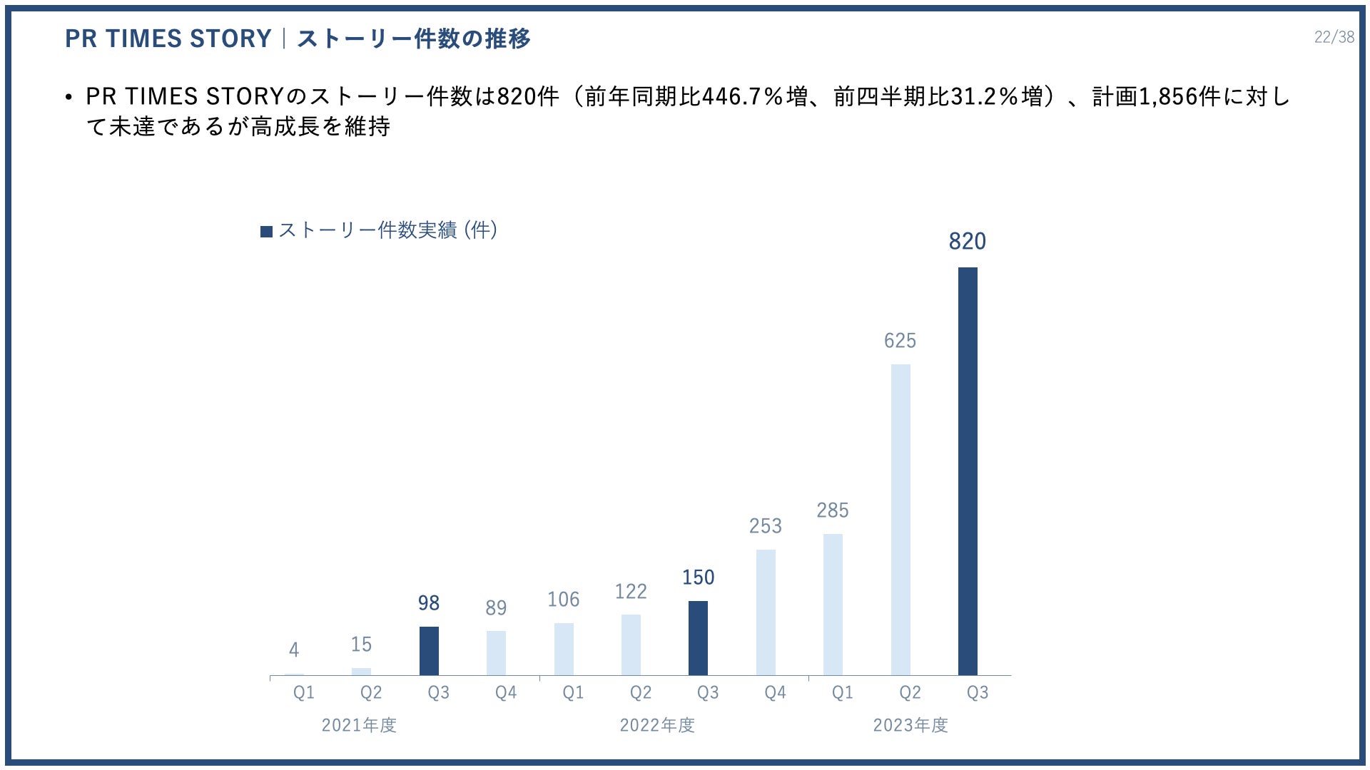 「PR TIMES STORY」は、この第3四半期の利用は820件と前年同期比446.7%増、前四半期比31.2%増となりました。計画1856件に対して未達であるものの、高成長を維持しています。